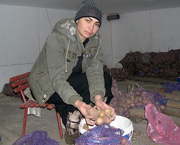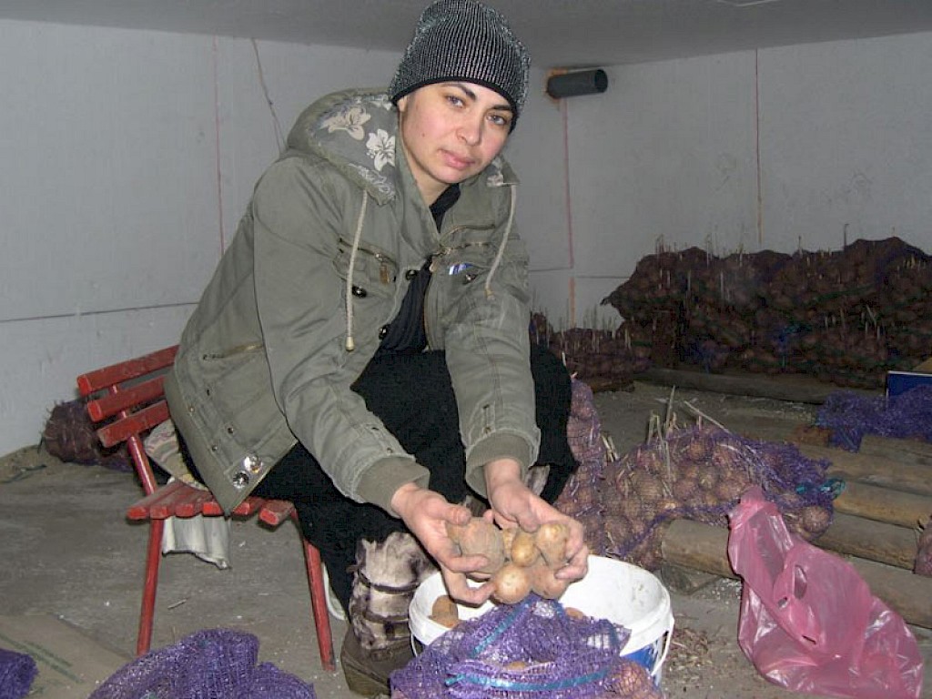 Nach dem Essen bringen wir sie in unsere Vorratshalle, wo sie für uns Kartoffeln sortiert und von Keimen befreit. So hatte Nadja ein warmes Mittagessen und unsere Kartoffeln wurden von Keimen befreit, uns beiden wurde geholfen.