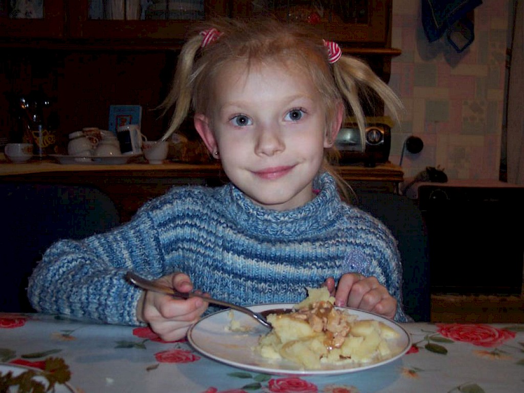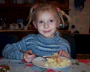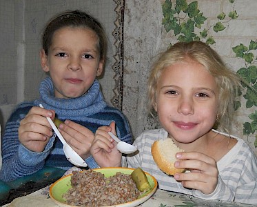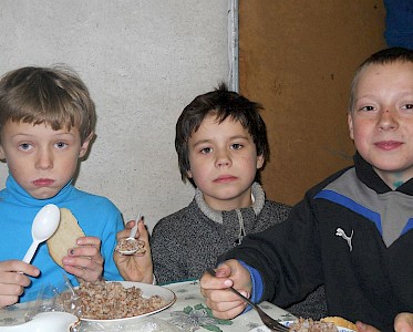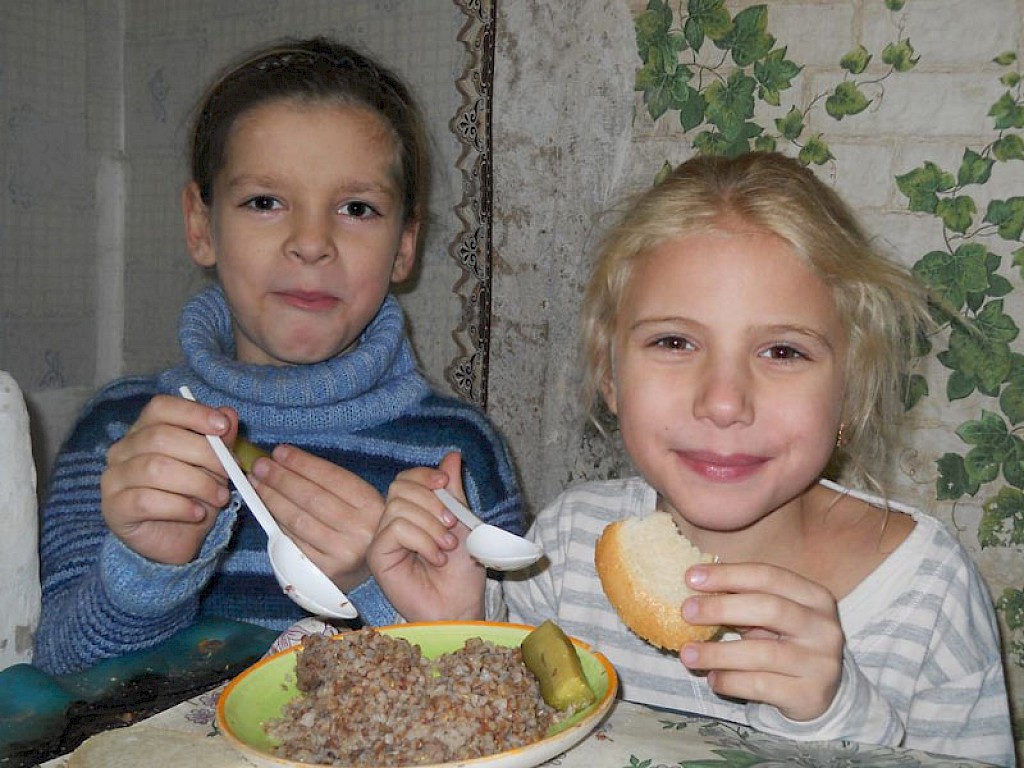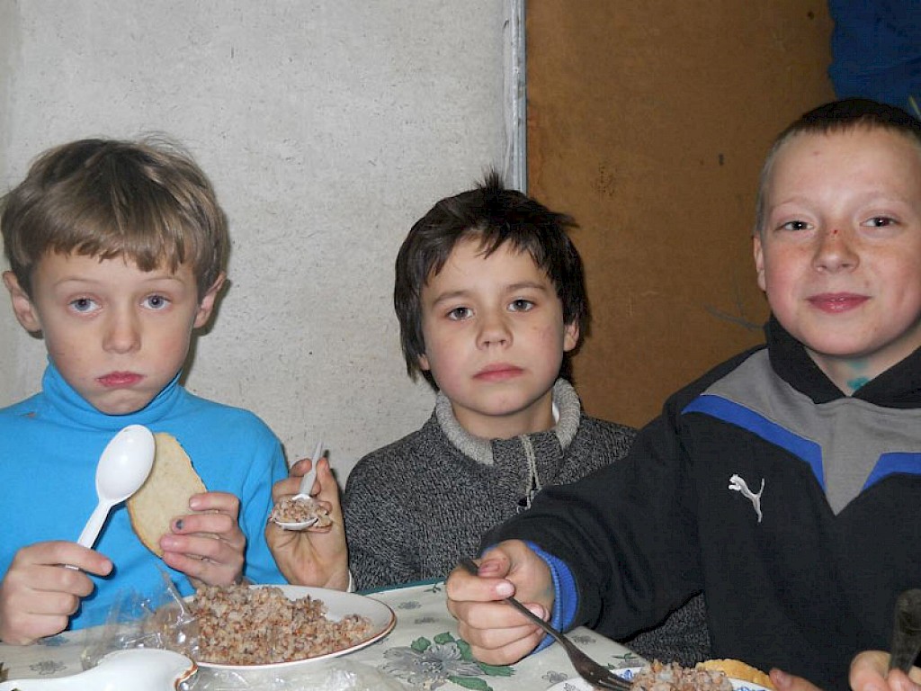 Im nächsten Augenblick stürzen alle zum Essenstisch und auch Nastja sucht sich einen Platz. Die Kinder schließen ihre Augen zum Gebet, für Nastja sicher ein ungewohnter Moment. Dann trägt auch schon Wera das Mittagessen in den Raum und die Jungen und Mädchen können es kaum noch abwarten, dass es endlich losgeht.