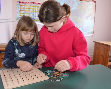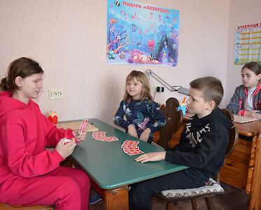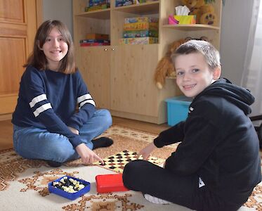 „Jegor, ich erkläre dir, wie man Dame spielt“, schlägt Sofia vor. Im Nu sitzen die beiden vor dem Schachbrett. Wir ermutigen die älteren Kinder, den Jüngeren zu helfen. Das Selbstbewusstsein der Großen wächst. Die Kleinen erhalten Aufmerksamkeit und Zuwendung.