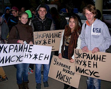 Was dann passiert übertrifft all ihre Erwartungen. 1500 Jugendliche sind gekommen, gute Redner aus der ganzen Ukraine. Die Bühne ist von Scheinwerfern hell erleuchtet. Professionelle Musiker spielen begeisternde Lieder.