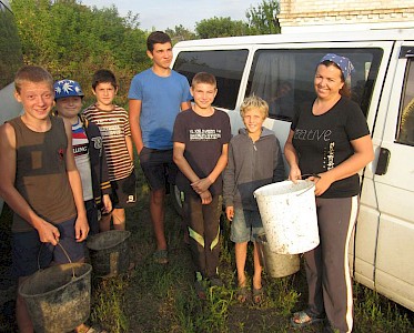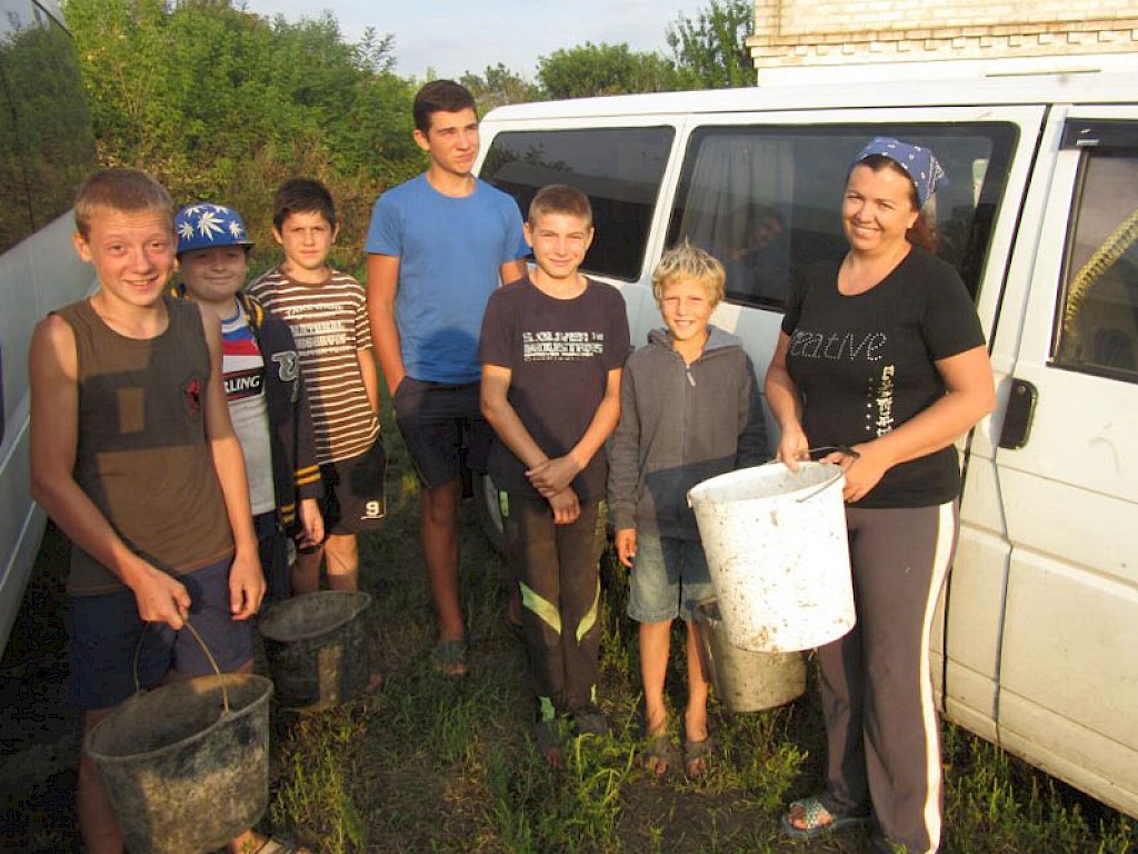 6:00 Uhr morgens. Müde trotten einige Jungen am frühen Morgen über die staubige Dorfstraße in Boschedarjewka. Sie haben sich gemeldet, um bei der Kartoffelernte auf dem großen Acker hinter unserem „Zufluchtsort“ in Odarjewka zu helfen.