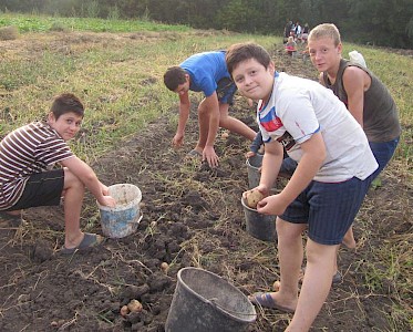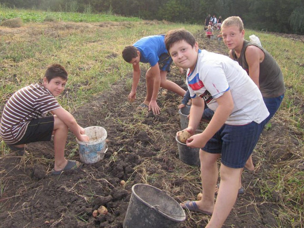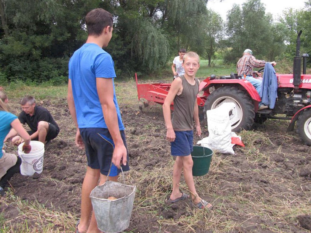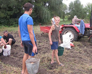 Nachdem wir sie durch „Vergessene Dörfer“ nach Odarjewka gefahren haben, werden sie von Peter Degtjar, unserem LKW Fahrer, begrüßt, in ihre Aufgabe eingewiesen. Obwohl die Sonne gnadenlos vom Himmel brennt, arbeiten die Jungen eifrig mit. Am späten Nachmittag sind über drei Tonnen Kartoffeln geerntet.