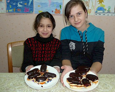 Am Mittagstisch in unserem „Zufluchtsort“ in Pawlowka gibt es immer ein lustiges Geschnattere. Jeder will erzählen, was am Vormittag in der Schule passiert ist. Nach dem Hauptgang warten alle auf den Nachtisch. Heute gibt es Kakao und Kekse, die wir in unserem „Backstudio“ selbst gebacken haben.