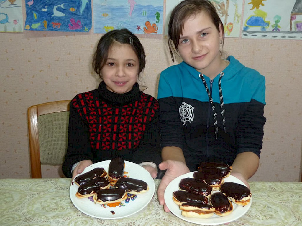 Am Mittagstisch in unserem „Zufluchtsort“ in Pawlowka gibt es immer ein lustiges Geschnattere. Jeder will erzählen, was am Vormittag in der Schule passiert ist. Nach dem Hauptgang warten alle auf den Nachtisch. Heute gibt es Kakao und Kekse, die wir in unserem „Backstudio“ selbst gebacken haben.