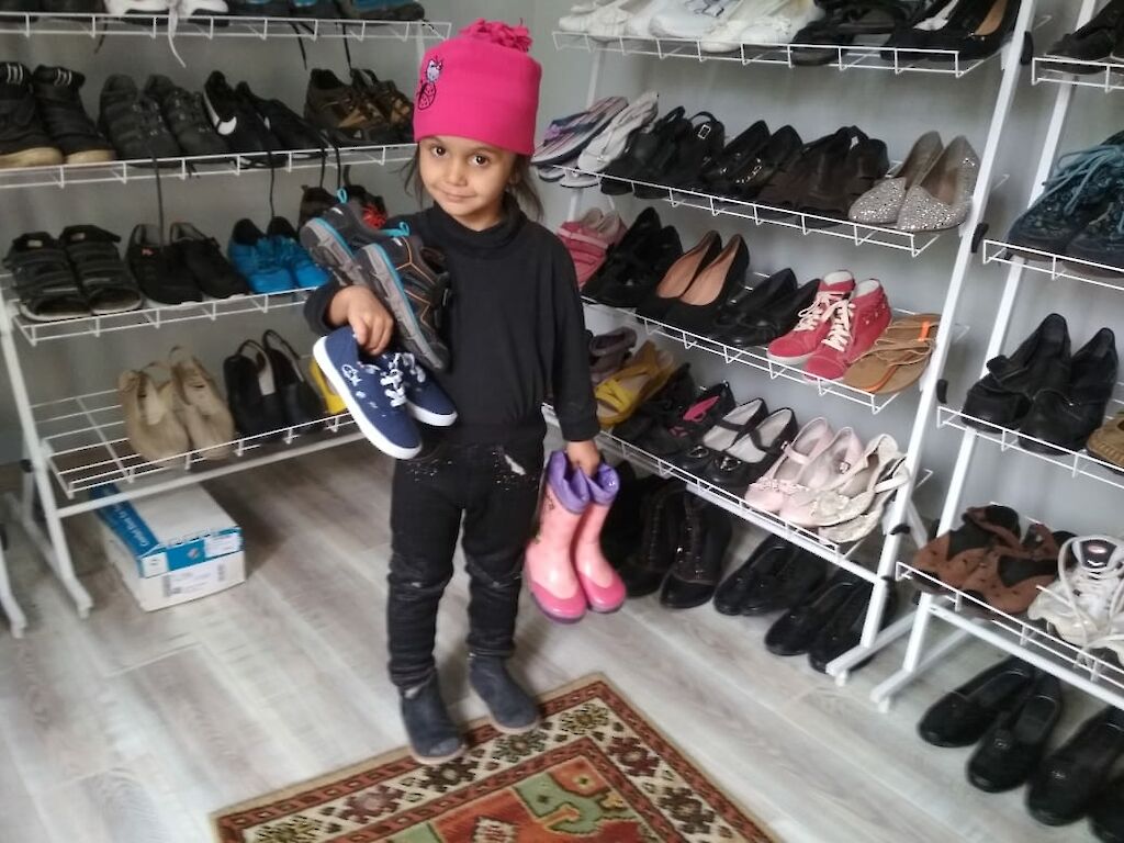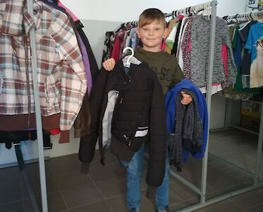 Nun haben wir angefangen in Swetlowodsk und in unseren „Zufluchtsorten“ in Boschedarjewka und in Odarjewka „Kleiderkammern“ zu bauen. Wir haben für diese Kleiderkammern Regale und Kleiderständer gebaut. In Zukunft können wir für unsere Kinder dort besser Kleidung und Schuhe aussuchen.