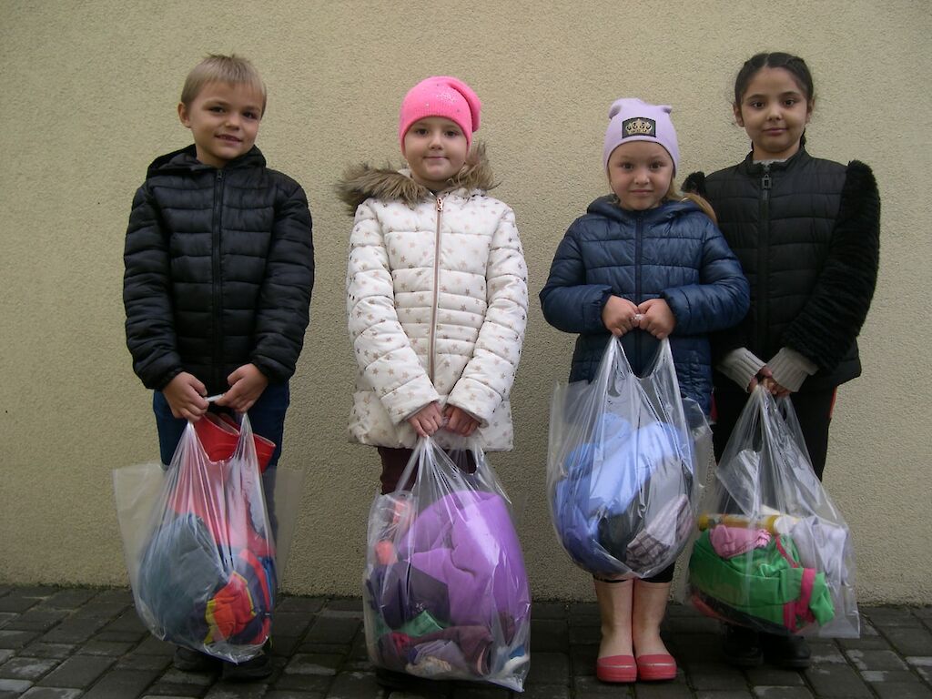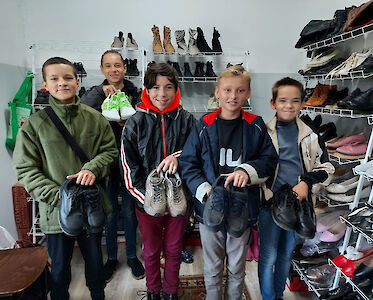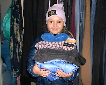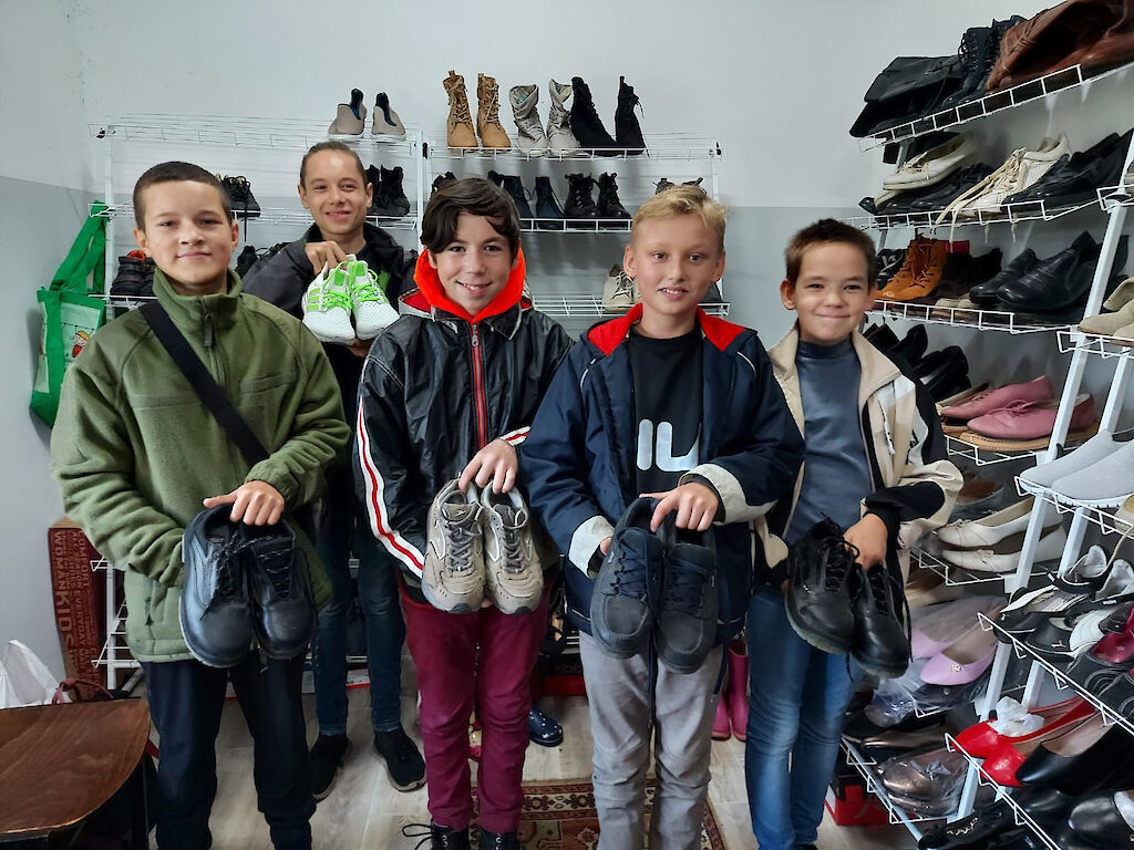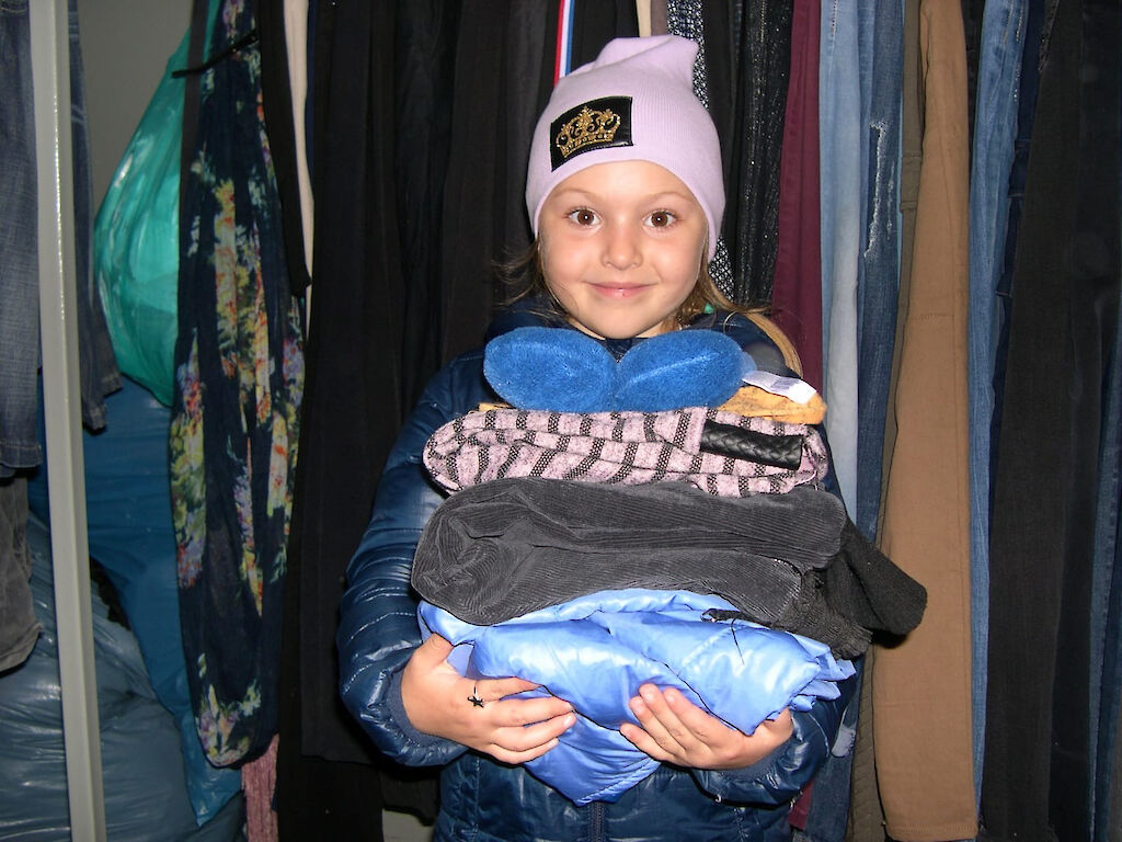 Die Temperaturen in der Ukraine während der Wintermonate fallen häufig zweistellig unter 0 Grad. Warme Kleidung ist lebensnotwendig! Kinder wachsen schnell und brauchen wieder neue Schuhe und Jacken. Wie gut, dass wir in unseren Häusern Kleiderstübchen eingerichtet haben. In kleinen Gruppen gehen wir mit den Jungen und Mädchen dorthin und suchen warme Kleidung aus. „Schau mal, auf der Mütze ist eine Krone abgebildet. Jetzt bin ich eine Prinzessin!“ „Und meine Gummistiefel haben Hörner!“