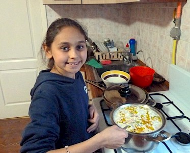 Und dann hat die Suppe so gut geschmeckt, dass wir Natascha und Alessia jeden Tag in der Küche finden. Nun kochen sie nicht nur Suppen, sie probieren immer neue Rezepte aus. Und vor einer Woche haben sie angefangen Kuchen zu backen.