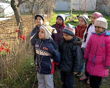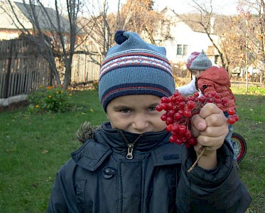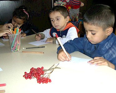 Im Herbst wandern wir mit den Jungen und Mädchen durch den Wald, sammeln Blätter zum Basteln und suchen Motive, die wir später malen können. Als wir heute einen kleinen Zweig mit roten Beeren fanden, begann Richard zum ersten Mal ein buntes Bild zu malen, was uns natürlich alle erfreut hat.