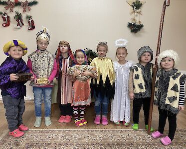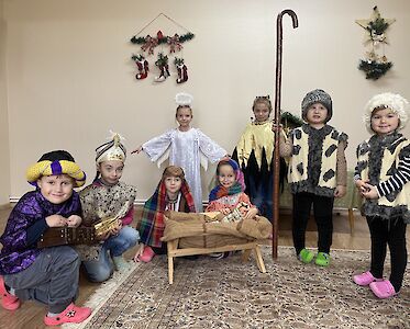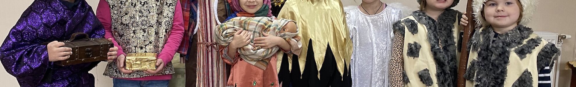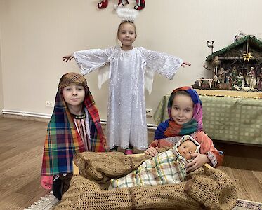 Wir haben zusammen die Weihnachtsgeschichte gelesen. Später durften sich die Jungen und Mädchen verkleiden. Maria hielt stolz eine Puppe in ihren Armen, das neugeborene Jesuskind. Wir spielten die Geschichte nach. Dazu hörten wir Weihnachtsmusik und für einige Momente vergaßen die Kinder den Krieg und die Kampfflugzeuge, die über unsere Städte und Dörfer fliegen.