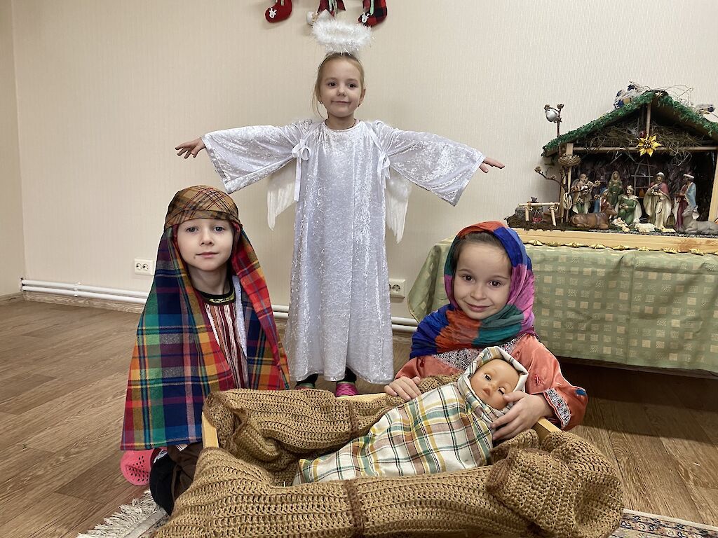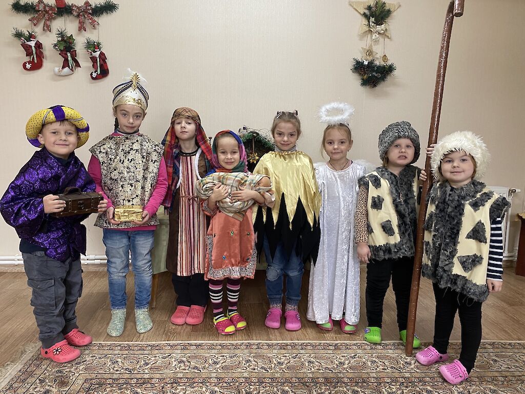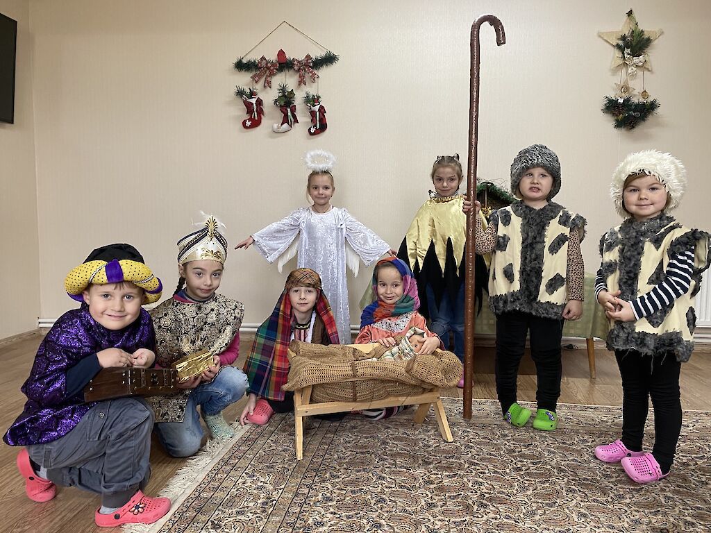 Wir haben zusammen die Weihnachtsgeschichte gelesen. Später durften sich die Jungen und Mädchen verkleiden. Maria hielt stolz eine Puppe in ihren Armen, das neugeborene Jesuskind. Wir spielten die Geschichte nach. Dazu hörten wir Weihnachtsmusik und für einige Momente vergaßen die Kinder den Krieg und die Kampfflugzeuge, die über unsere Städte und Dörfer fliegen.