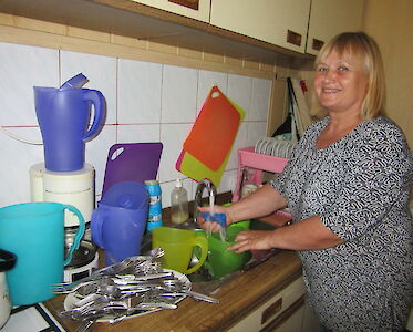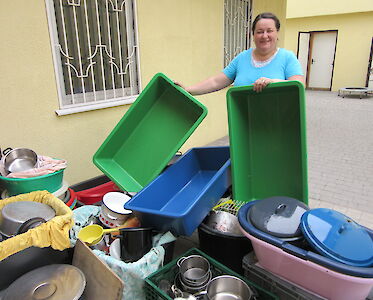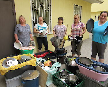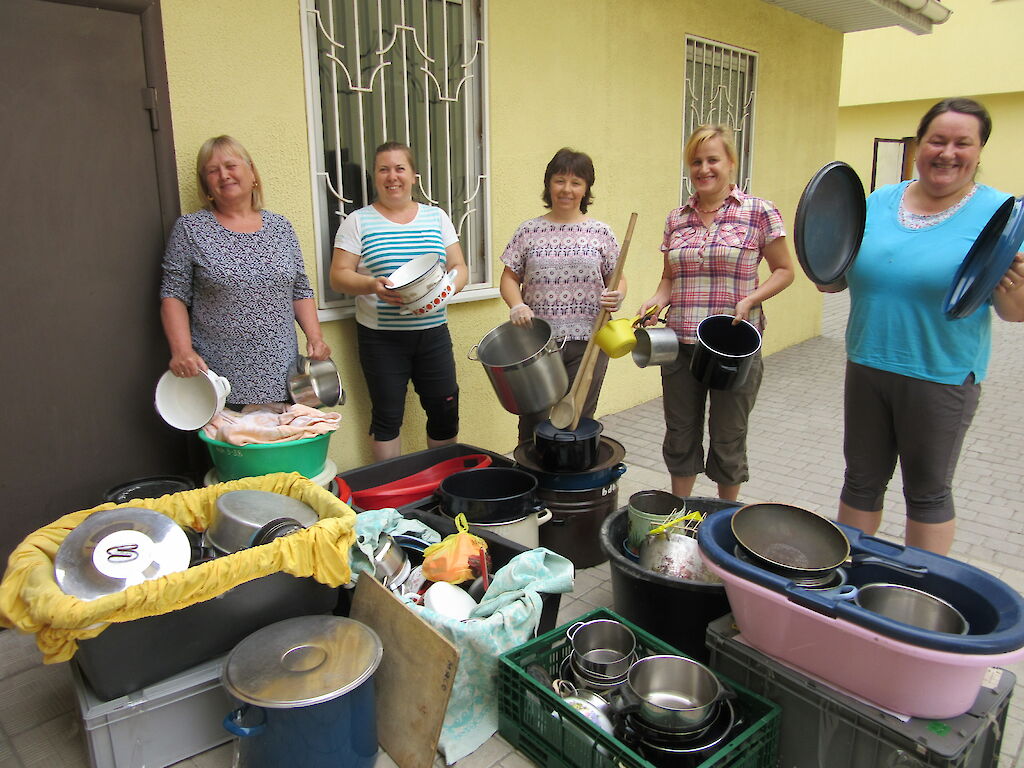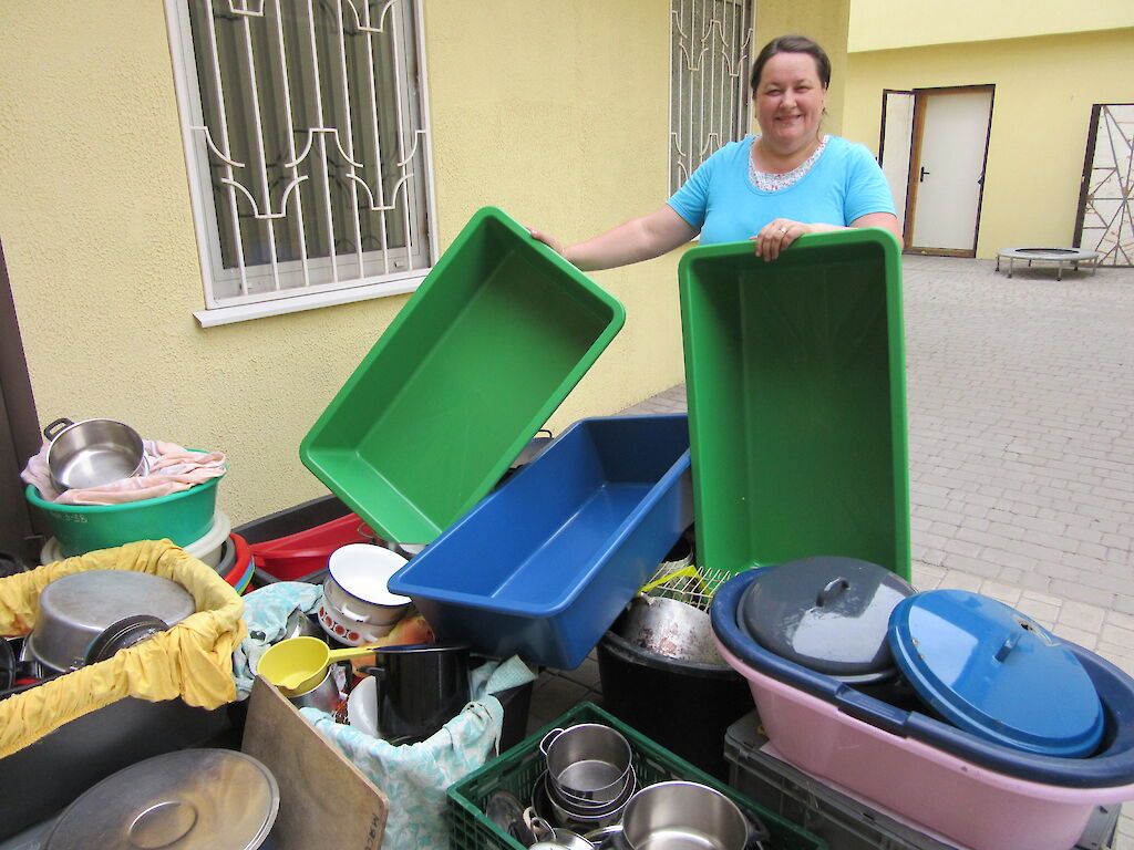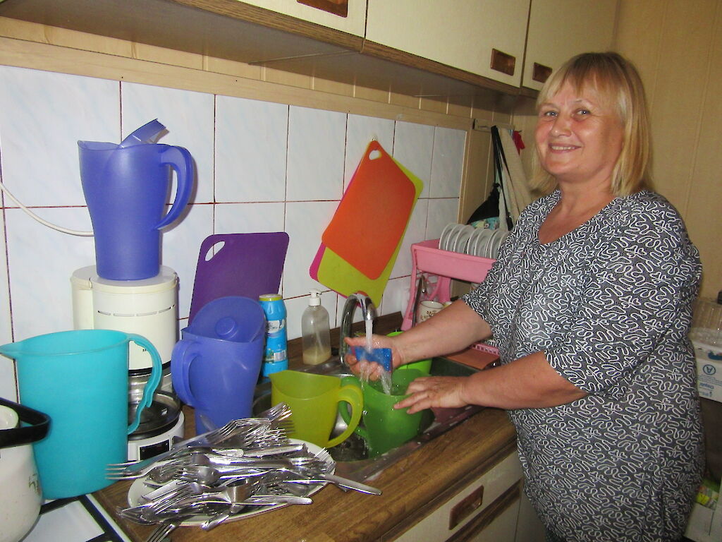 Unsere Köchinnen müssen in den kommenden Tagen über 100 Kinder und Mitarbeiter versorgen. All das muss geplant und vorbereitet werden. Anja Losowaja leitet die Küche. Sie ist nicht nur für die Lebensmittel und das Geschirr verantwortlich, sie wird für gute Stimmung sorgen.
