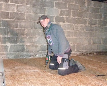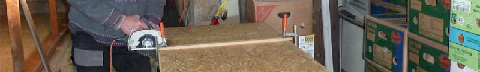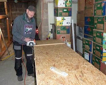 Nachdem 2017 das Dach neu gedeckt und Stromleitungen verlegt wurden, wird aktuell der Fußboden im hinteren Bereich der Lagerräume erneuert. Auf eine Unterkonstruktion werden Sperrholzplatten geschraubt.