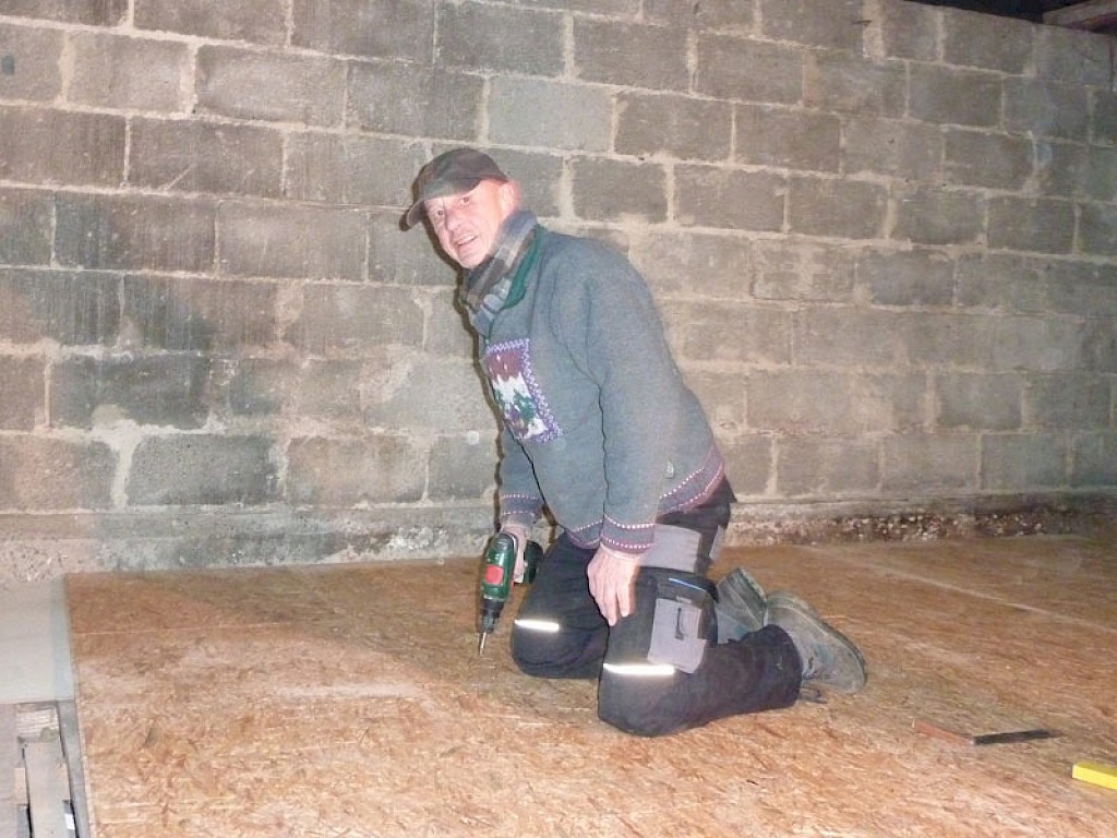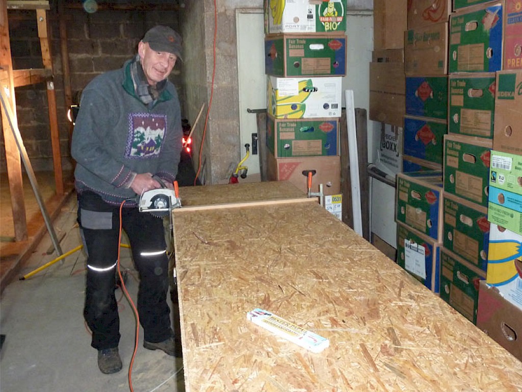 Nachdem 2017 das Dach neu gedeckt und Stromleitungen verlegt wurden, wird aktuell der Fußboden im hinteren Bereich der Lagerräume erneuert. Auf eine Unterkonstruktion werden Sperrholzplatten geschraubt.