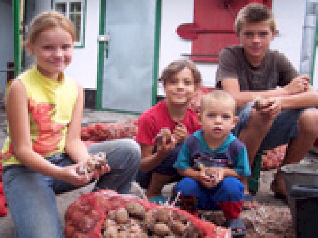 „Tante Wera, was gibt es heute zu essen?“ Ausgehungert stürzen Jungen und Mädchen jeden Tag in die Küche im „Zufluchtstort“ in Odarjewka und staunen, was unsere Köchin Wera heute wieder einmal auf den Tisch gezaubert hat. Sie wollen sich aber nicht nur bedienen lassen, sie wollen helfen. Zuerst werden Kartoffeln sortiert und von Keimlingen befreit, dann müssen sie geschält werden. Zu Hause gibt es in den meisten Familien in den „Vergessenen Dörfern“ kaum etwas zu Essen. Überall sieht man heruntergekommene Kinder, die bettelnd von Hütte zu Hütte ziehen. Wir sind froh, dass wir dank der Hilfe aus Deutschland vielen Jungen und Mädchen jeden Tag die Teller füllen können.