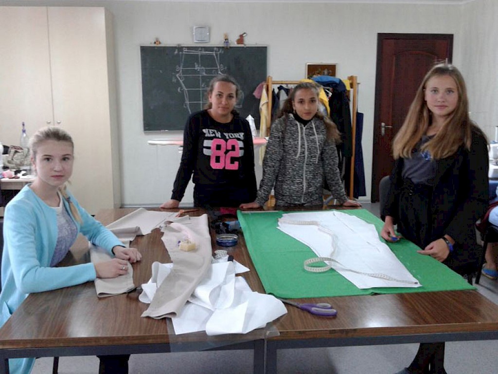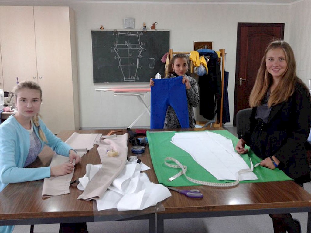 Alle sind gespannt, als Lena Grabenko, die unsere „Lehrwerkstatt für Mädchen“ leitet, die ersten Schritte erklärt. In der Zwischenzeit sind die ersten Leggins genäht. Nun wollen einige unserer Lehrlinge ihren Geschwistern zu Weihnachten Leggins nähen.