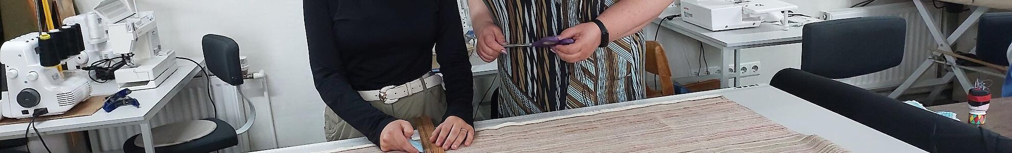 In unserer Lehrwerkstatt wird fleißig genäht. Es wird Stoff abgemessen und zugeschnitten. Die Nähmaschinen rattern.