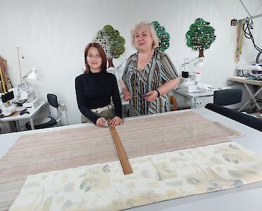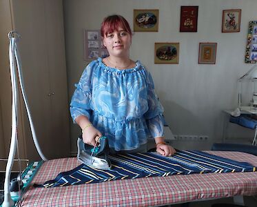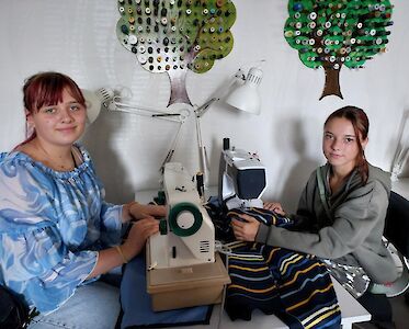 Unser Tageskinderheim am See braucht neue Kissenbezüge, Villa Sonnenschein hätte gerne bunte Kopftücher. Da sind die Mädchen mit vollem Eifer dabei. Trotz der täglichen Luftangriffe kommen sie zweimal pro Woche aus Pawliwka, einem Dorf ca. 12 km entfernt, nach Switlowodsk. Sie wünschen sich sehr, gut nähen zu lernen. Außerdem freuen sie sich, wenn sie sich nützlich machen können und ihre fertigen Arbeiten in unserer Mission zum Einsatz kommen.