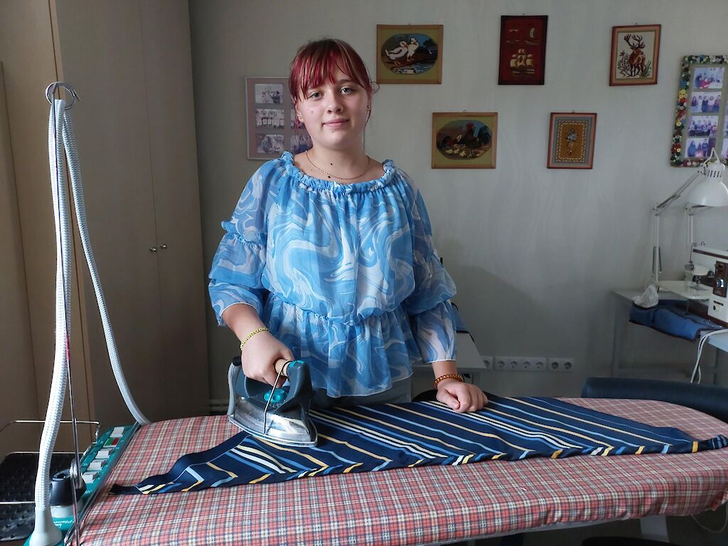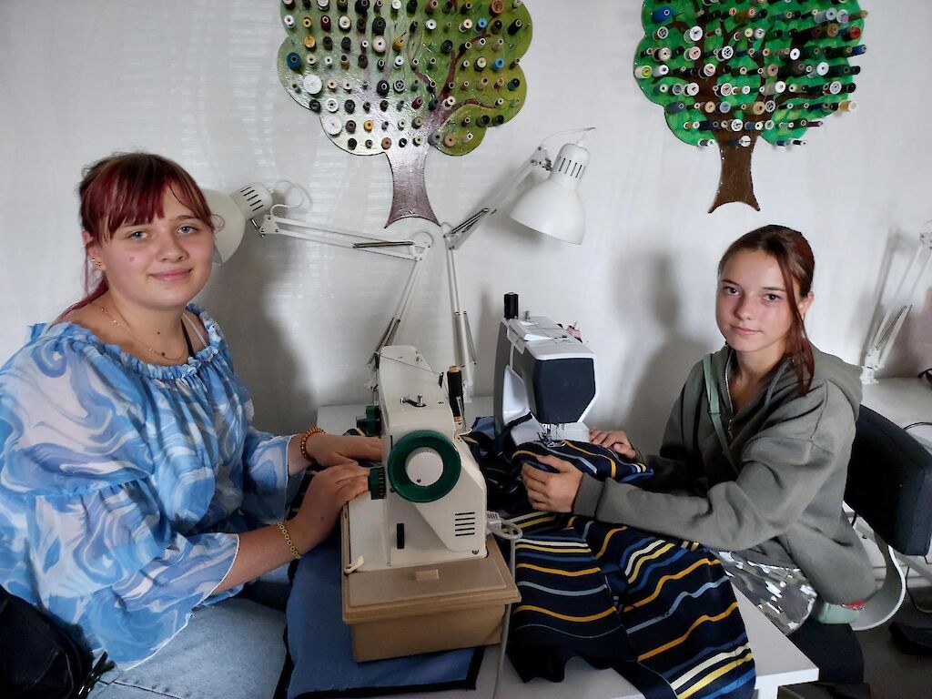 Unser Tageskinderheim am See braucht neue Kissenbezüge, Villa Sonnenschein hätte gerne bunte Kopftücher. Da sind die Mädchen mit vollem Eifer dabei. Trotz der täglichen Luftangriffe kommen sie zweimal pro Woche aus Pawliwka, einem Dorf ca. 12 km entfernt, nach Switlowodsk. Sie wünschen sich sehr, gut nähen zu lernen. Außerdem freuen sie sich, wenn sie sich nützlich machen können und ihre fertigen Arbeiten in unserer Mission zum Einsatz kommen.
