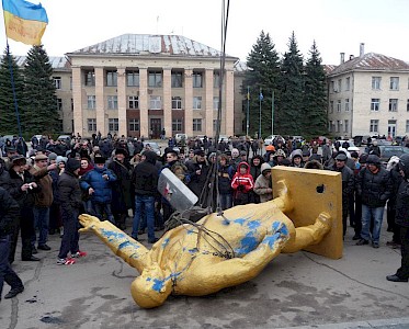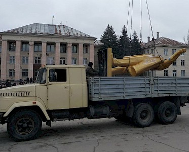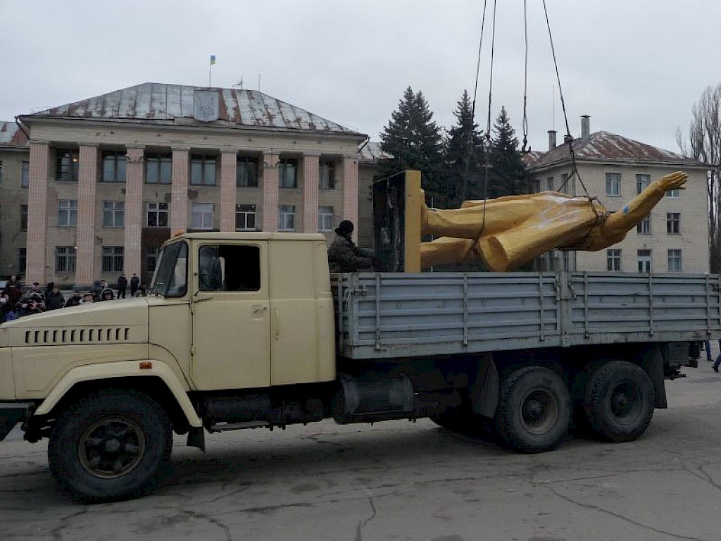 Gestern haben wir darüber berichtet, dass bereits 19 Lenin Statuen in der Ukraine gestürzt wurden. Heute war es endlich so weit. Die Stadtverwaltung von Swetlowodsk besorgte einen Kran, entfernte das Standbild. Der Sockel ist tief in der Erde verankert.