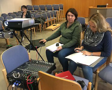 Am Montag hatten wir noch einmal mit „Soruschka“ eine letzte Probe in unserer Gemeinde in Rechtenbach. Hier wurde besonders an der Technik gearbeitet. In diesem Jahr haben wir zwei neue Mitarbeiterinnen im Team, die vor einer großen Herausforderung stehen.