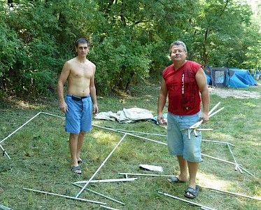 Nach fünf Stunden ist es dann so weit, eine schillernde Zeltstadt wartet am Strand vom Dnepr Fluss auf unsere Gäste, 20 Schlafzelte, 2 Küchenzelte, große Essenszelte, Duschen, Toiletten, Spielplätze, Sportanlagen und vieles mehr. Das Thermometer klettert auf weit über 30 Grad. Da hilft nur ein erfrischendes Bad im Fluss. Dann kommt der Feinschliff. Es wird eingeräumt, aufgeräumt, dekoriert und angemalt.