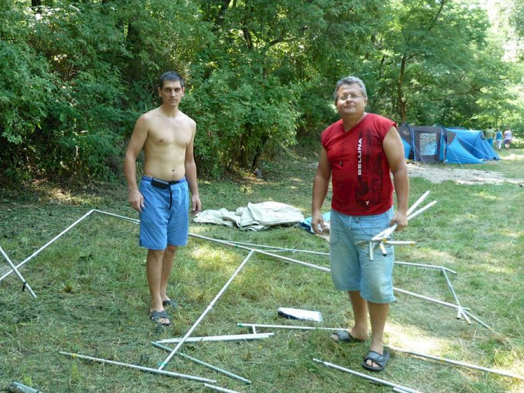 Nach fünf Stunden ist es dann so weit, eine schillernde Zeltstadt wartet am Strand vom Dnepr Fluss auf unsere Gäste, 20 Schlafzelte, 2 Küchenzelte, große Essenszelte, Duschen, Toiletten, Spielplätze, Sportanlagen und vieles mehr. Das Thermometer klettert auf weit über 30 Grad. Da hilft nur ein erfrischendes Bad im Fluss. Dann kommt der Feinschliff. Es wird eingeräumt, aufgeräumt, dekoriert und angemalt.