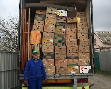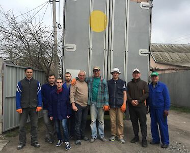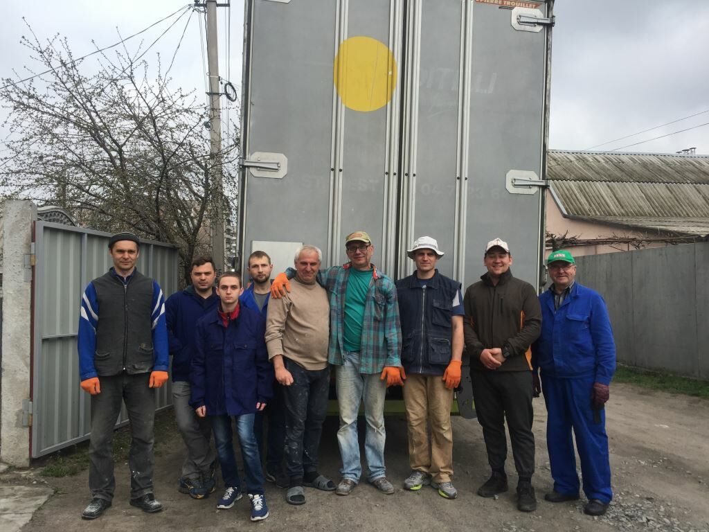 In der Zwischenzeit sind Dima Grabenko und Peter Degtjar wieder gut in der Ukraine geladen. Unter Aufsicht eines Zollbeamten wurde das ganze Material in unsere Lagerhalle in Swetlowodsk abgeladen. Viele Helfer haben sich an dieser Aktion beteiligt. Am Ende wurde die Lagerhalle von dem Zollbeamten versiegelt.