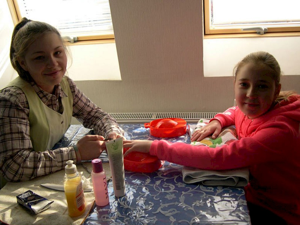 Doch was passiert, wenn ihre Schulzeit langsam zu Ende geht? In unserer „Lehrwerkstatt für Jungen“ lernen sie handwerkliche Fähigkeiten, die Mädchen lernen Nähen. Seit Februar unterrichtet Darina Panassenko die ersten fünf Mädchen in Maniküre.