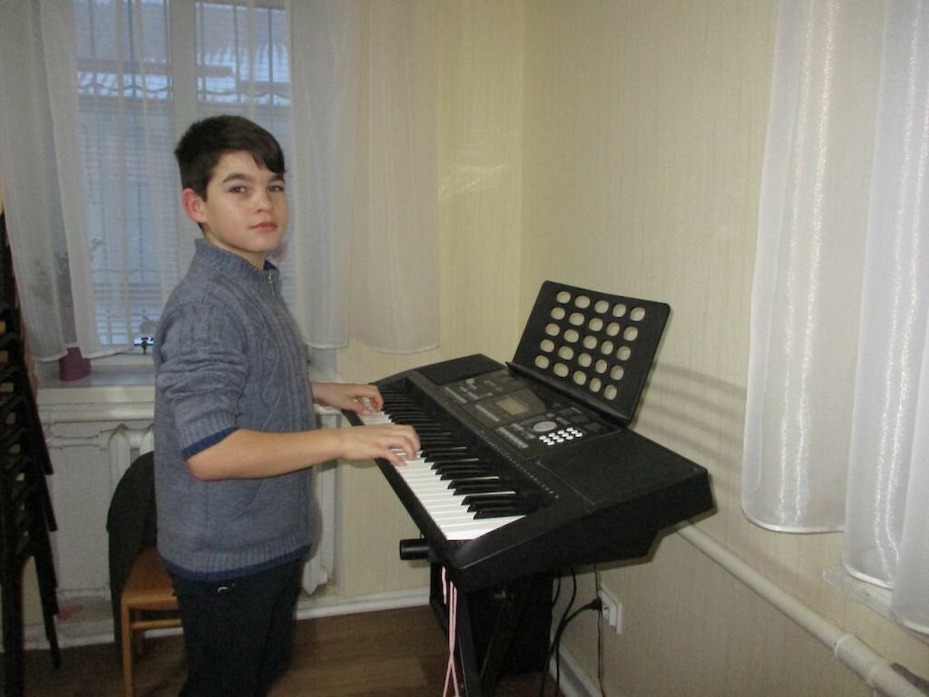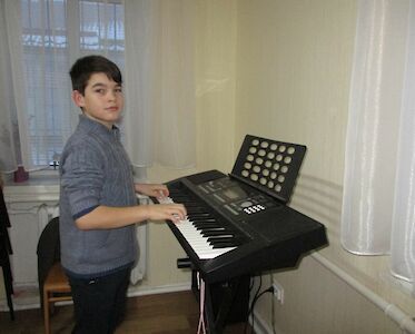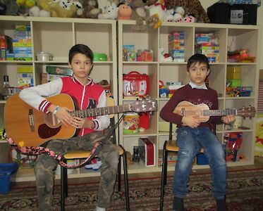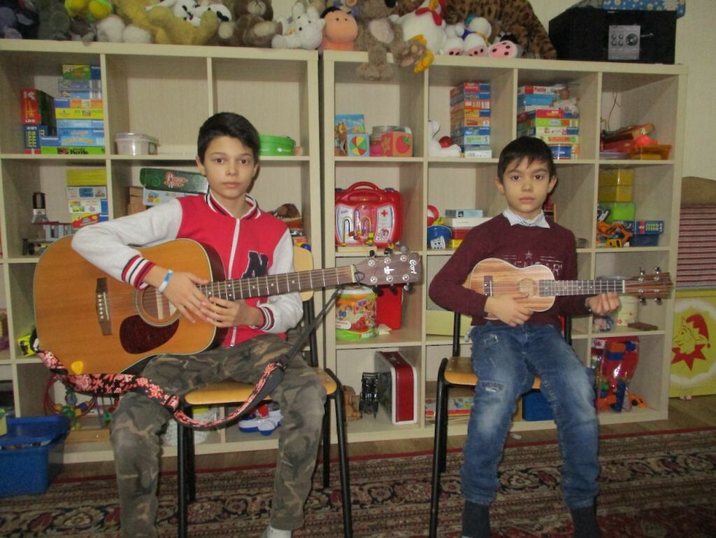 Nach ihrem Treffen gibt Andrej den Jungen noch Musikunterricht. Ein Junge lernt schon längere Zeit in unserem „Zufluchtsort“ Keyboard zu spielen. Die anderen lernen Gitarre oder Cajon.
