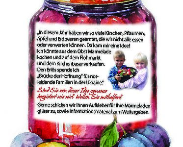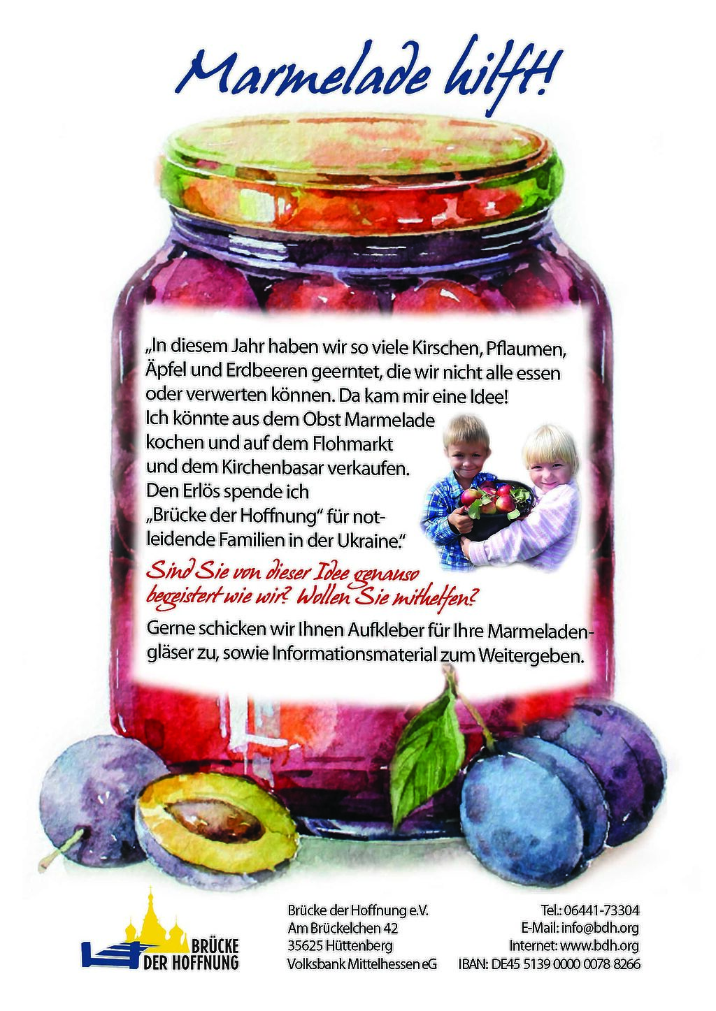 Im Frühjahr 2019 starteten wir ein neues Projekt „Marmelade hilft“. Eine Missionsfreundin erzählte uns freudestrahlend: „Mir kam da so eine Idee: In diesem Jahr haben wir so viel Obst geerntet. Ich könnte daraus Marmelade kochen und auf dem Flohmarkt und Kirchenbasar verkaufen. Den Erlös spende ich Ihnen für notleidende Familien in der Ukraine!“