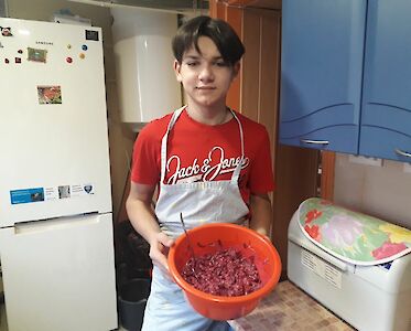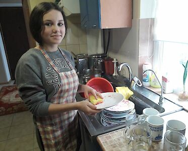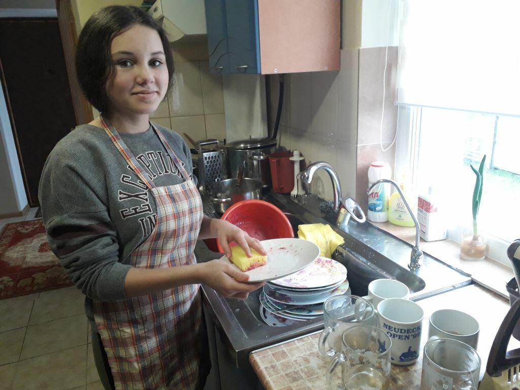 Sonja Merkuschina hilft im Tageskinderheim am See in der Küche. Sie hat von unserer Mitarbeiterin Anja Losowaja bereits viele Fähigkeiten gelernt. Es ist wichtig für uns, dass unsere Kinder Dinge lernen, die ihnen später im Leben helfen. Außerdem können sie sich in ihrem Minijob etwas Taschengeld verdienen.