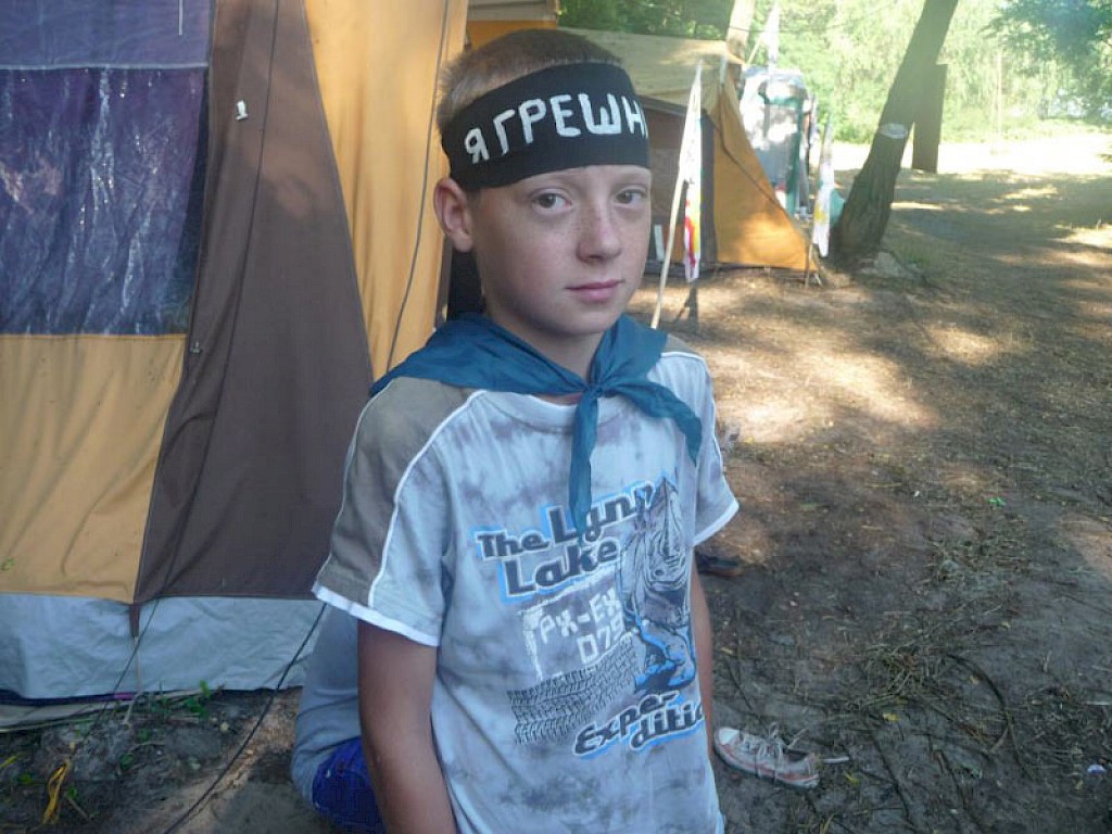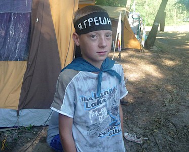 “Das sieht ja aus wie bei einer Beerdigung. Solche Bänder tragen die Leute bei uns im Dorf, wenn jemand gestorben ist, nur ohne Aufschrift.” sagt Stas. Um seinen Kopf trägt er, wie auch alle anderen im Camp, ein Band mit der Aufschrift „Ich bin ein Sünder“. Der Junge wächst in Schorsk in einer armen Familie ohne Vater auf. Dies ist sein erstes Sommerlager, alles ist neu für ihn. Die verschiedenen Themen bewegen ihn sehr tief.