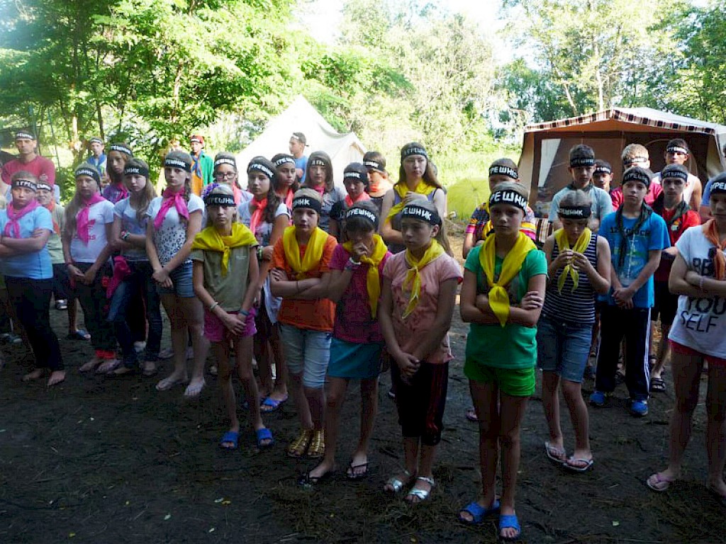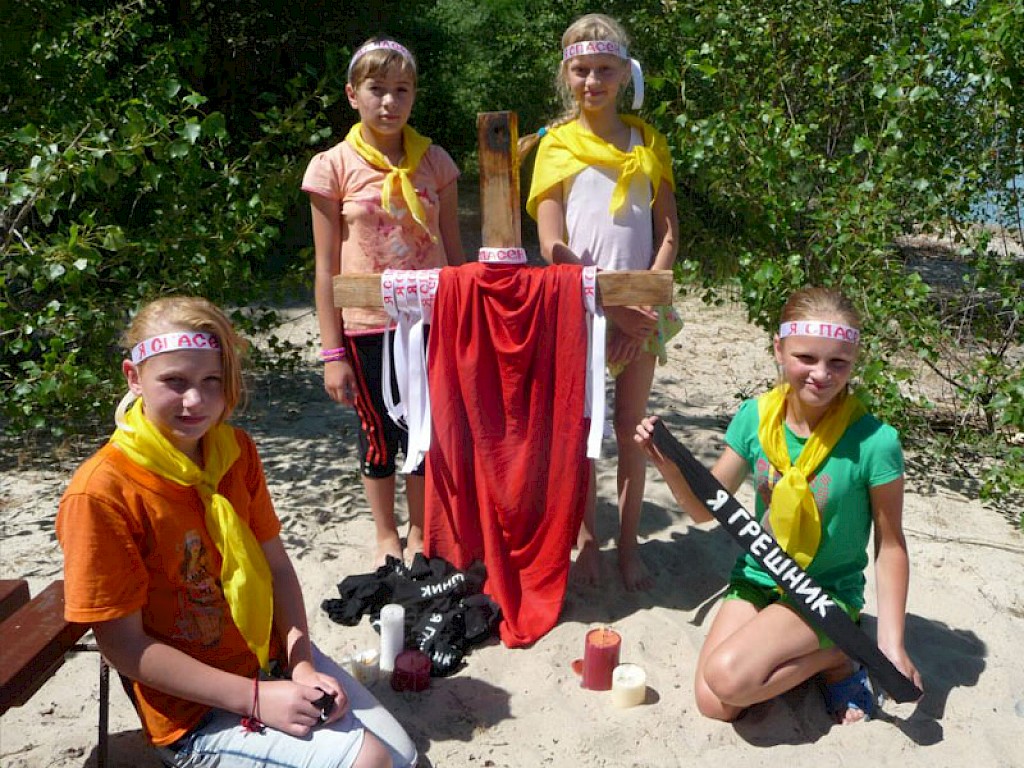 „Müssen wir diese Stirnbänder jetzt für immer tragen?“ fragt er seinen Teamleiter. Das Tagesmotto lautet „Mit voller Kraft voraus!“ Dabei sprechen wir über ein zielorientiertes Leben. Leben wir ohne Sinn und einfach in den Tag hinein oder streben wir nach sinnvollen Zielen und setzen alles daran, sie auch zu erreichen? „ Ich habe gerade nur ein Ziel, nämlich dieses furchtbare Band loszuwerden.“- flüstert Stas seinem Teamleiter zu. Während des Tages geht jedes Team an einen ruhigen Platz, an dem ein Kreuz aufgestellt ist. Dort haben die Kinder die Gelegenheit in kleinen Gruppen mit ihrem Teamleiter zu sprechen und zu beten. „Ja, Stas, du hast recht! Das fühlt sich schon etwas wie eine Beerdigung an. Gott gibt uns die Gelegenheit, unser altes Ich abzulegen und eine neue Identität und Erlösung von ihm geschenkt zu bekommen. Das Band ist nur ein Symbol. Unser Herz und unser Verstand sind aufgefordert, eine Entscheidung zu treffen. Jesus schenkt jeder Person diese Möglichkeit.“ – erklärt der Teamleiter.