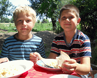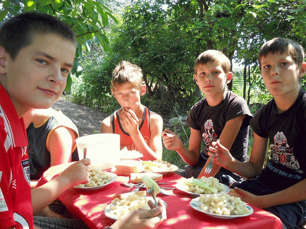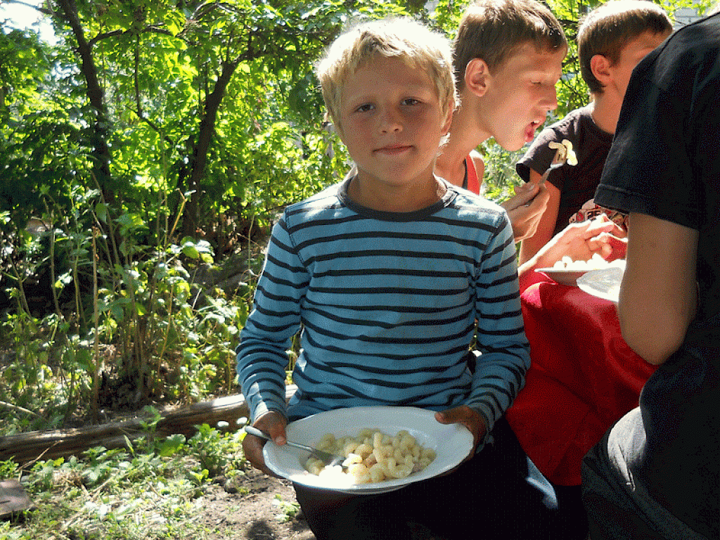 Nachdem wir unser Häuschen verloren haben, treffen sich die „Vergessenen Kinder in Schorsk“ im Garten von Mascha Galagowetz. Heute hat Natascha Mitina ein leckeres Mittagessen gekocht.