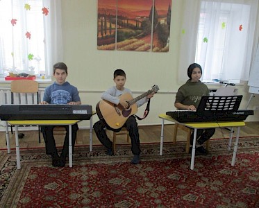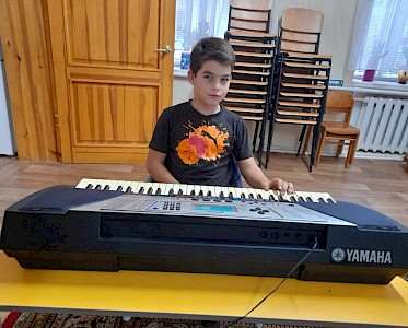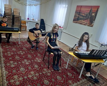 Tanja Kononenko, die unseren „Zufluchtsort“ in Odarjewka leitet, hat eine besondere musikalische Begabung. Sie lernt mit ihren kleinen Schülern neue Lieder und unterrichtet sie, Musikinstrumente zu spielen.