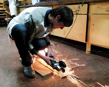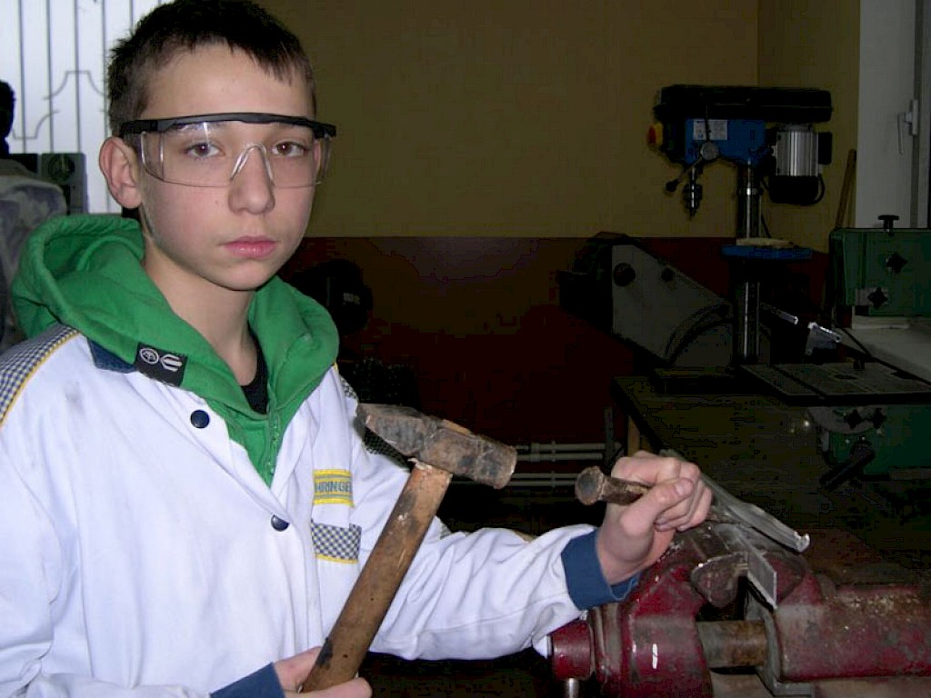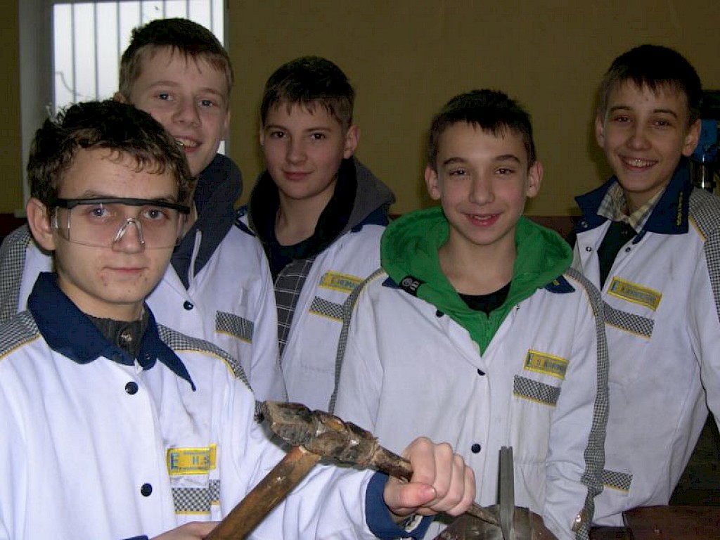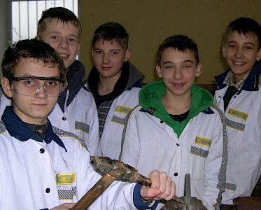 Die Mädchen schauen erstaunt durch ein Fenster in die „Lehrwerkstatt“. Findet da ein Feuerwerk statt? Da sprühen die Funken. Um einen kleinen Erfolg zu sehen, machen die Jungen aus einer Münze einen Ring. Da können wir schon bald die Ersten von ihnen in unsere „Lehrwerkstatt“ aufnehmen.