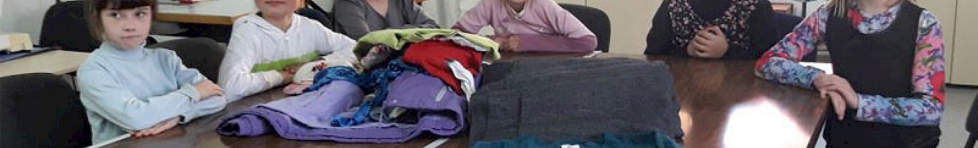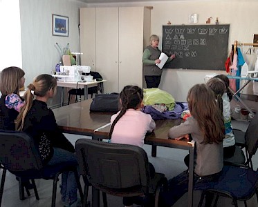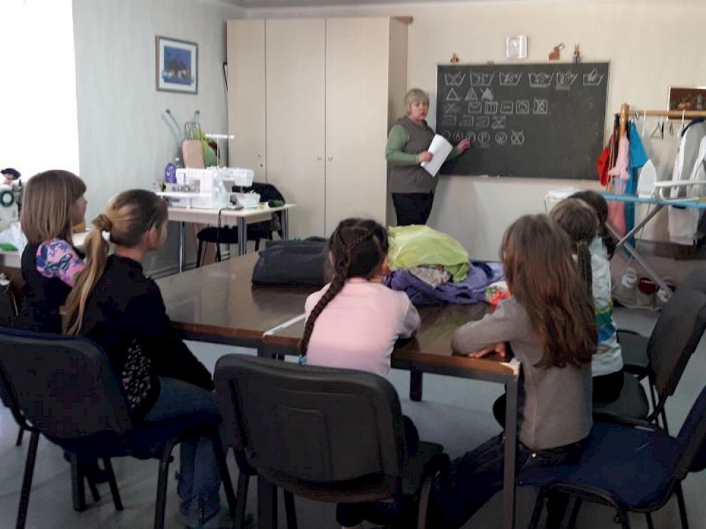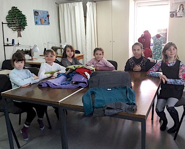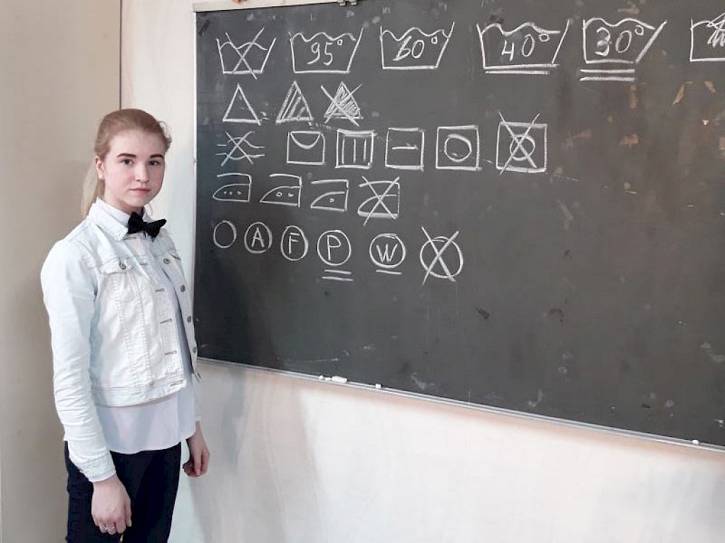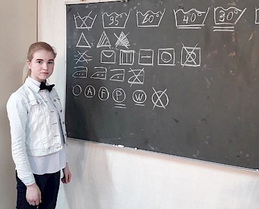 Heute sprechen wir darüber, wie man seine Kleidung richtig behandelt. Wie wäscht man sie, wie bügelt man, wie bewahrt man sie richtig auf. Da werden die Schilder in den Kleidungsstücken erklärt. Am Ende von unserem Seminar gab es eine herausfordernde Abschlussprüfung.