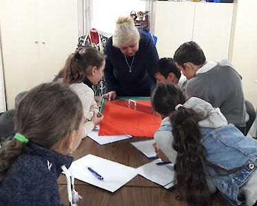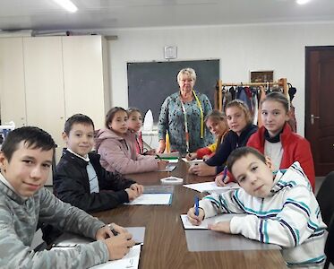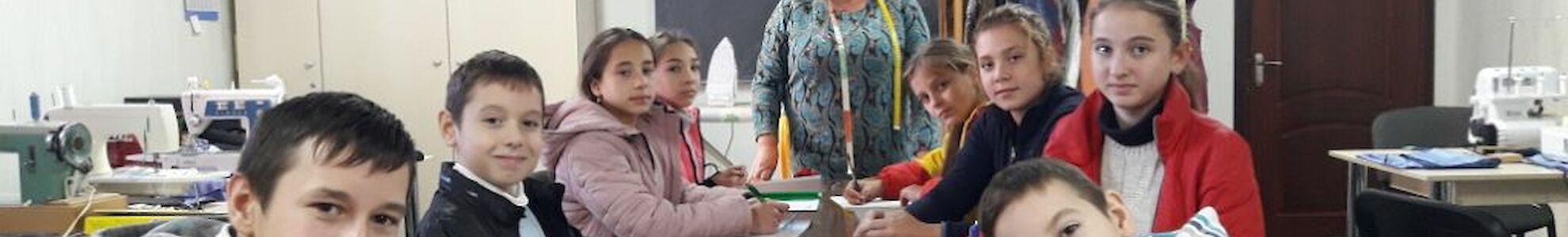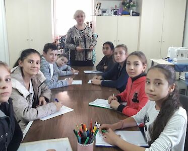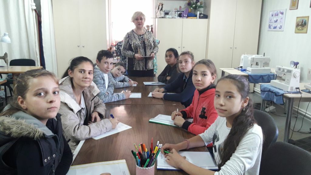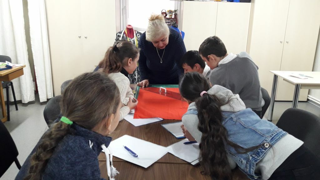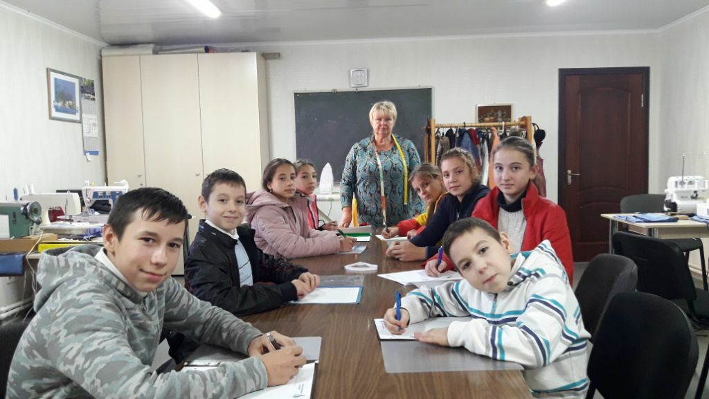 Gleich in der ersten Unterrichtsstunde erzählte Nastja, die Lena unterstützt, wie sie angefangen hat und dass sie heute in einer Berufsschule den Beruf einer Näherin erlernt. In der Zwischenzeit sitzen sie bereits hinter unseren Nähmaschinen.