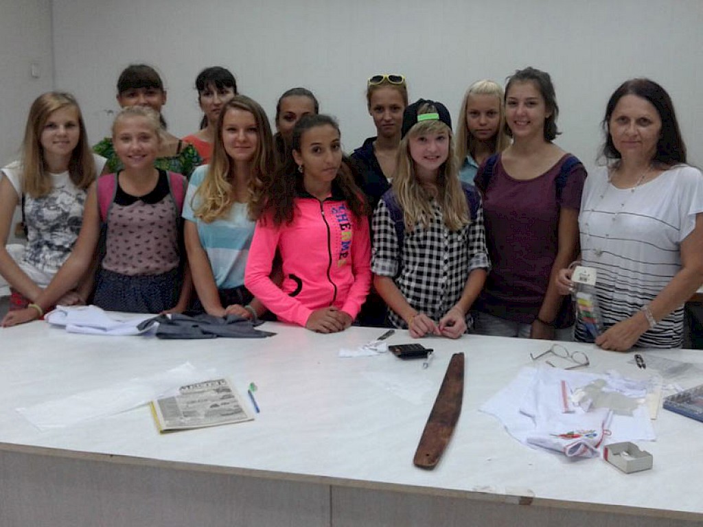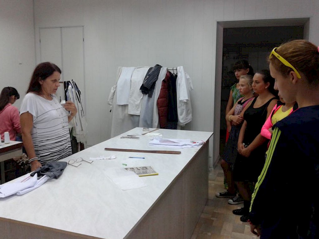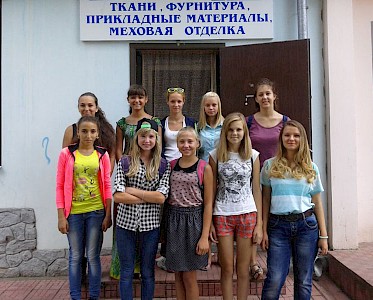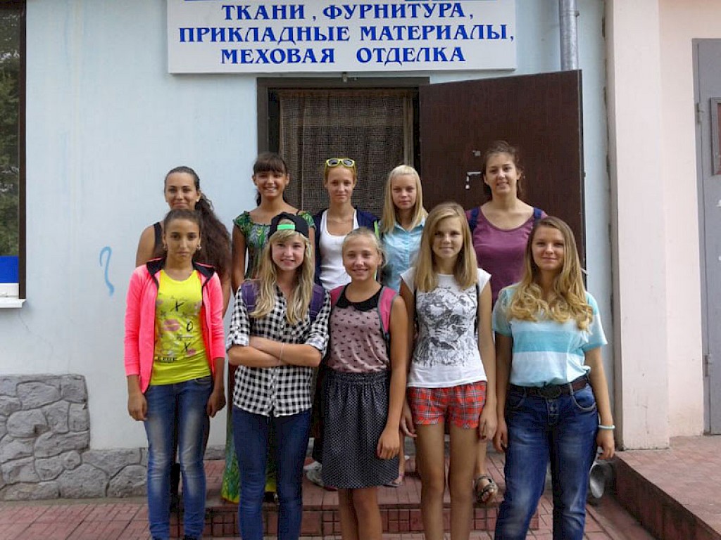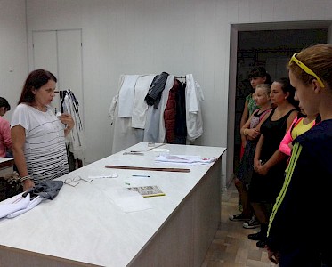 Heute geht ein Wunsch der Mädchen unserer „Lehrwerkstatt“ in Erfüllung, wir besuchen eine professionelle Nähwerkstatt. Larissa, die Leiterin, führt uns durch die Räume. Unsere Lehrlinge erstarren fast vor Ehrfurcht.
