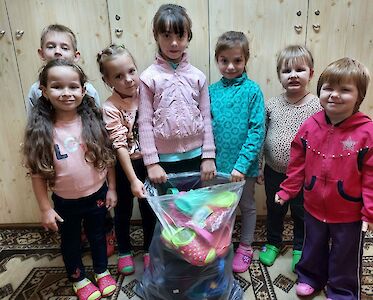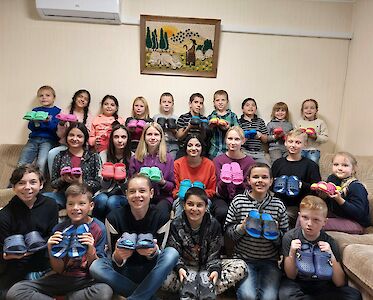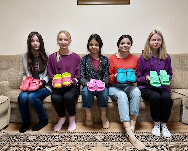 Um die Füße der Kinder warm zu halten, haben wir eine Reihe neuer Hausschuhe gekauft. Wenn die Füße warm sind, dann ist der ganze Körper warm. Die Mädchen und Jungen haben sich über die bunten „Crocs“ riesig gefreut. „Tante Lisa, schau mal, auf meinen Schuhen sind sogar Blumen,“ freute sich Dascha. „Und meine sind pink!“, meint Anja stolz. Jeder hat nun seine eigenen Hausschuhe, die er sogar signieren durfte.