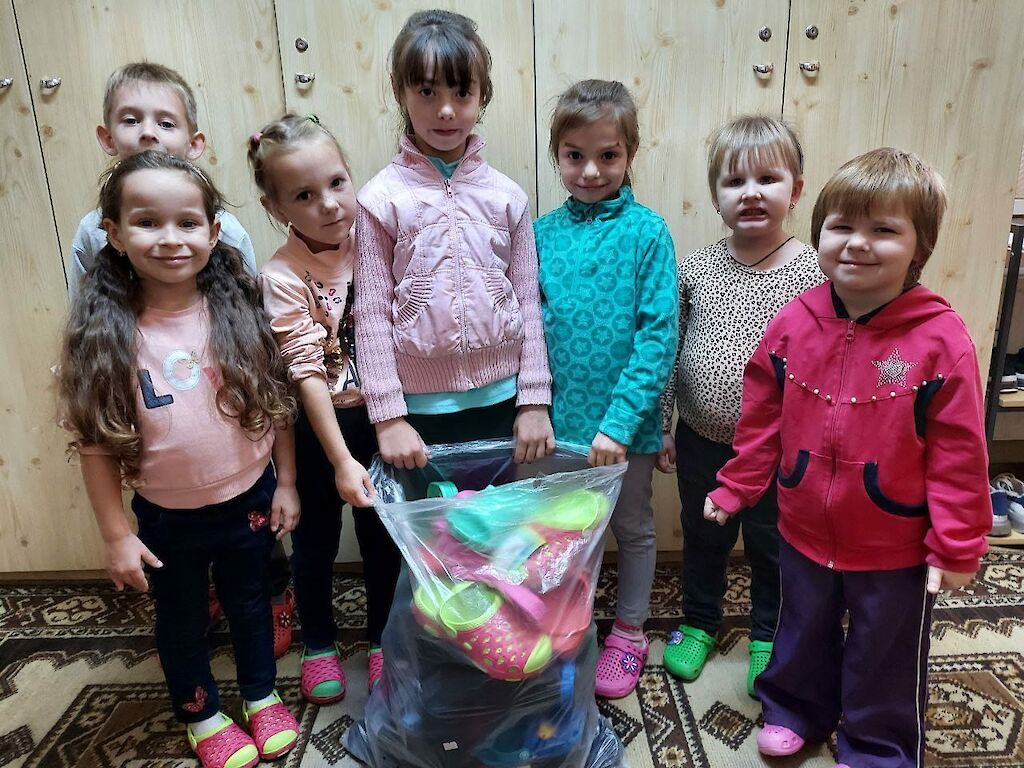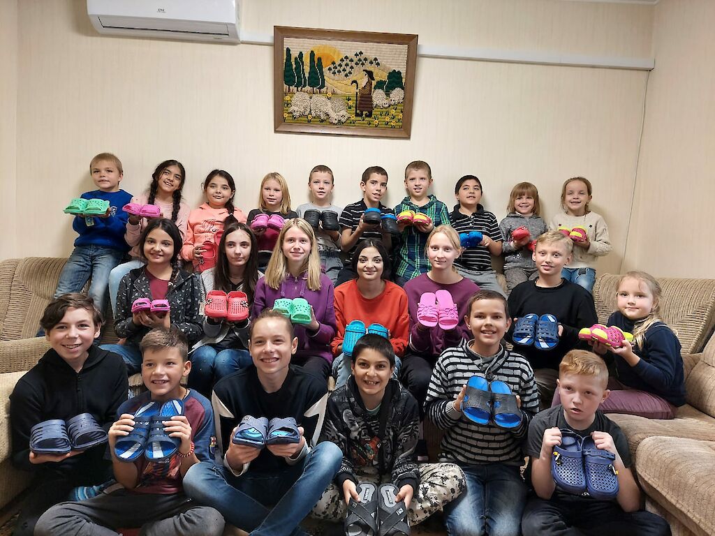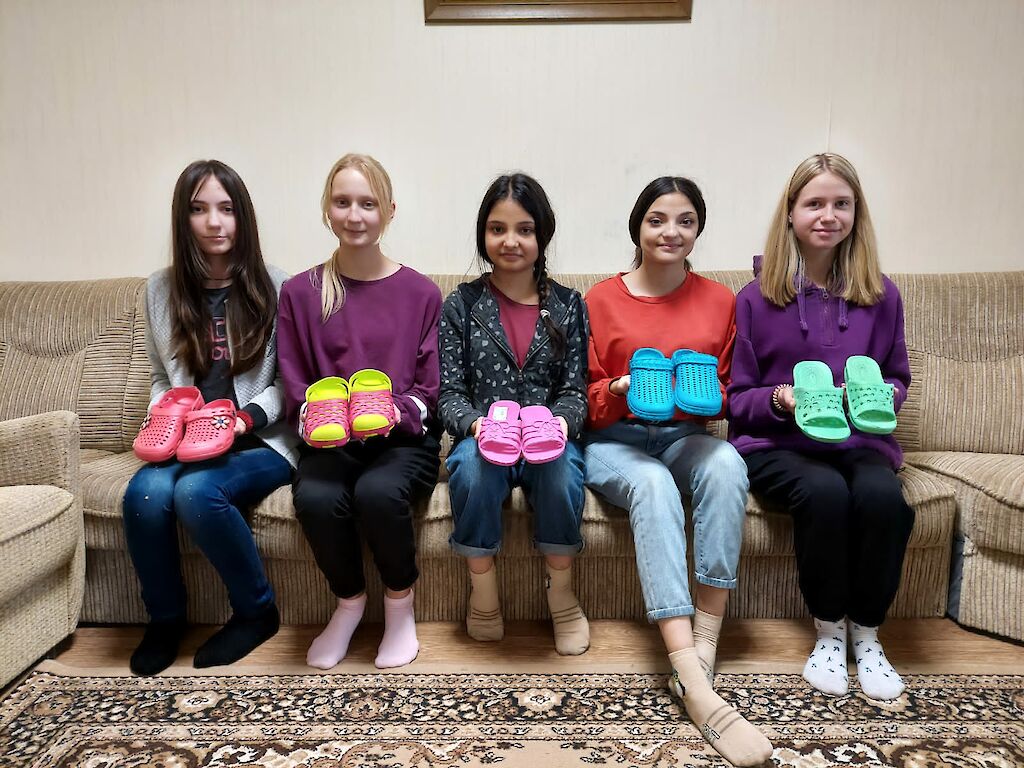 Um die Füße der Kinder warm zu halten, haben wir eine Reihe neuer Hausschuhe gekauft. Wenn die Füße warm sind, dann ist der ganze Körper warm. Die Mädchen und Jungen haben sich über die bunten „Crocs“ riesig gefreut. „Tante Lisa, schau mal, auf meinen Schuhen sind sogar Blumen,“ freute sich Dascha. „Und meine sind pink!“, meint Anja stolz. Jeder hat nun seine eigenen Hausschuhe, die er sogar signieren durfte.