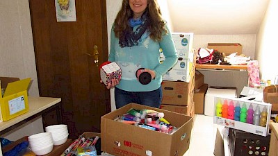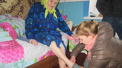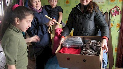 „Sie kommen! Sie kommen!“ Lustige Teenager springen aus unserem Fahrzeug, werden begeistert begrüßt. Wir gehen von Bett zu Bett. Heute haben wir ganz besondere Geschenke mitgebracht, Socken aus Deutschland, Socken aus unserer Aktion „10.000 Socken für die Ukraine“.