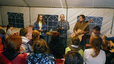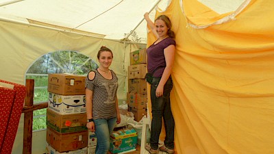„…ich brauche noch vier Schlafsäcke…und ich suche noch einige Decken…“ Eifrig sind unsere Mädels damit beschäftigt Zelte einzurichten. Es ist wichtig, dass niemand in der Nacht friert. Die Jungen haben ganz andere Aufgaben. Sie installieren Duschen, die seit dem letzten Jahr warmes Wasser haben, Toiletten, das Trampolin, ein Volleyballnetz.