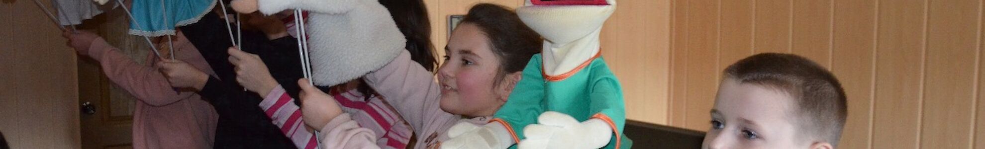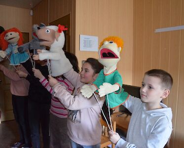 Mit Begeisterung üben unsere kleinen Gäste die Puppen unseres Puppentheaters zu führen. Das ist gar nicht so leicht. Ein Arm muss hoch gestreckt werden, die andere Hand ist für die beiden Hände der Puppe verantwortlich. Die Puppe soll sich entsprechend des Textes und der Szene bewegen. Das braucht viel Übung.