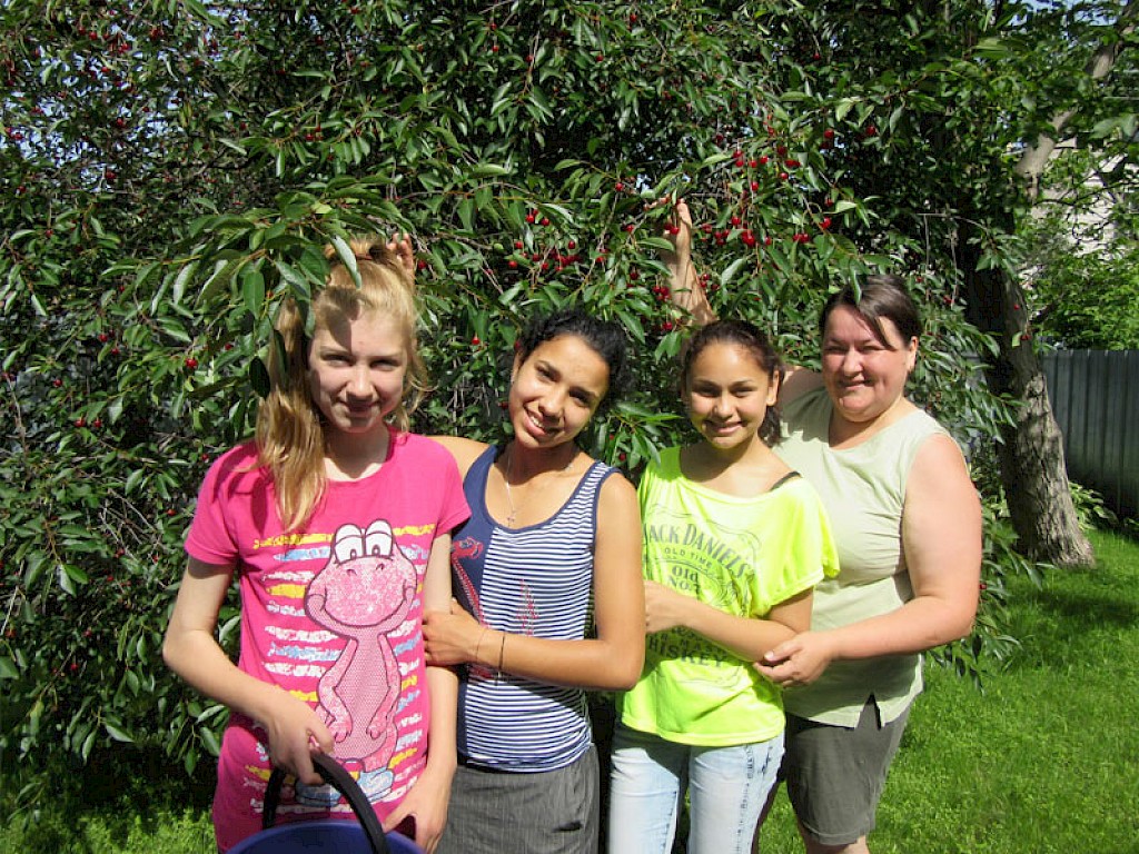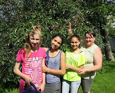 Die Äste von Kirschbäumen biegen sich, können all die Kirschen kaum noch tragen. Da laden uns Missionsfreunde an, in ihrem Garten Kirschen zu ernten. Bewaffnet mit Leitern und Eimern machen wir uns auf den Weg, kommen schwer beladen zurück.