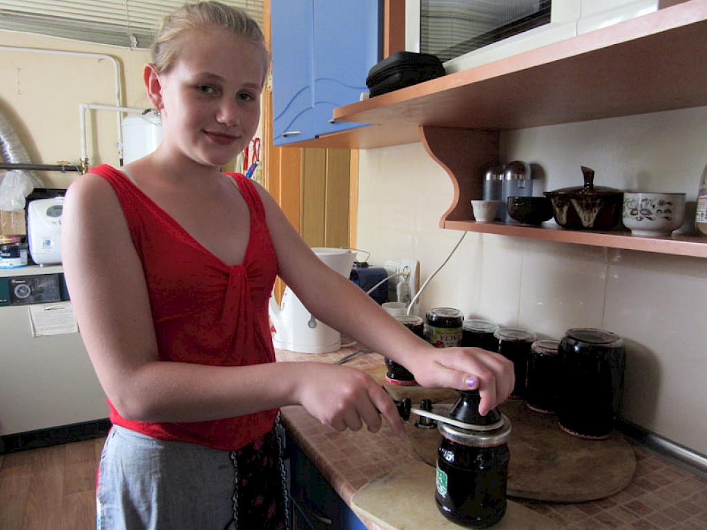 Nun beginnt die eigentliche Arbeit. Unsere Ernte muss eingeweckt, in Saft umgearbeitet werden, dass wir im Winter Kirschsaft trinken können. Unsere Mitarbeiter haben bereits alles vorbereitet.
