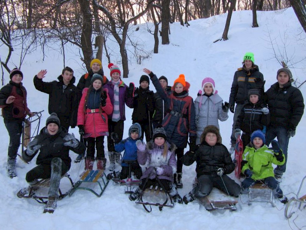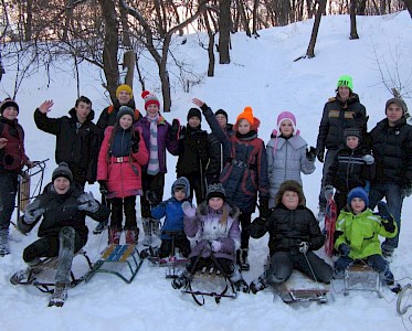 Unsere Kinder haben sich aber auch schon lange auf den Winter gefreut, haben ganz besonders auf den Schnee gewartet. Da wollen wir den Schnee natürlich auch genießen. Wir machen uns mit unseren Schlitten auf den Weg zu einem Hügel, zu einer lustigen Schlittenpartie.