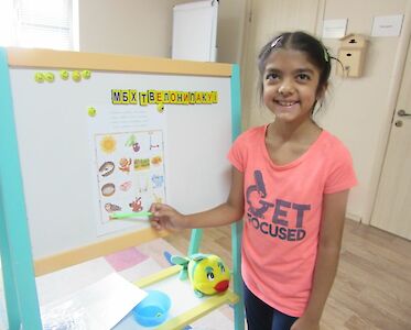 „Ich habe zu Hause jeden Tag weiter geübt Buchstaben zu schreiben!“ Ganz stolz hält Inessa ihr Blatt mit den Buchstaben in die Höhe. Dann geht es auch schon los. Nach dem Unterricht ist eine Eule zu Besuch, die erzählt, wie gefährlich es ist mit Streichhölzern zu spielen.