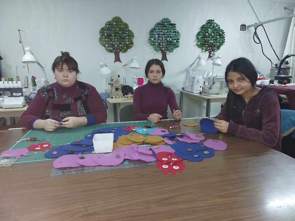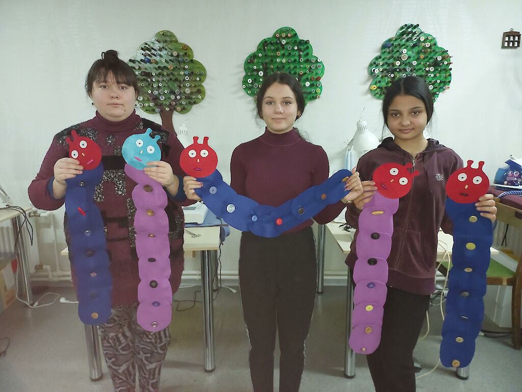 Unsere Mädchen in der Lehrwerkstatt sind klasse! Sie bekamen die Aufgabe, ein Lernspiel für unsere Kleinen im Spatzennest zu entwickeln. Mit viel Geduld gestalteten sie eine Raupe, die aus verschiedenen Kreisen besteht, die mit großen Knöpfen verbunden sind. Das Annähen der Knöpfe dauerte einige Zeit.