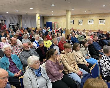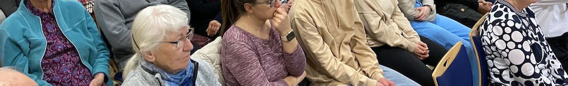 An diesem Sonntag war der Saal wieder bis auf den letzten Platz gefüllt. Wir haben uns gefreut viele gute Freunde zu treffen. Einige Missionsfreunde waren von weit her angereist, um unsere Mitarbeiterinnen zu treffen, um zu hören, wie es ihren Patenkindern oder unseren Mitarbeitern in der Ukraine geht, die sie unterstützen.
